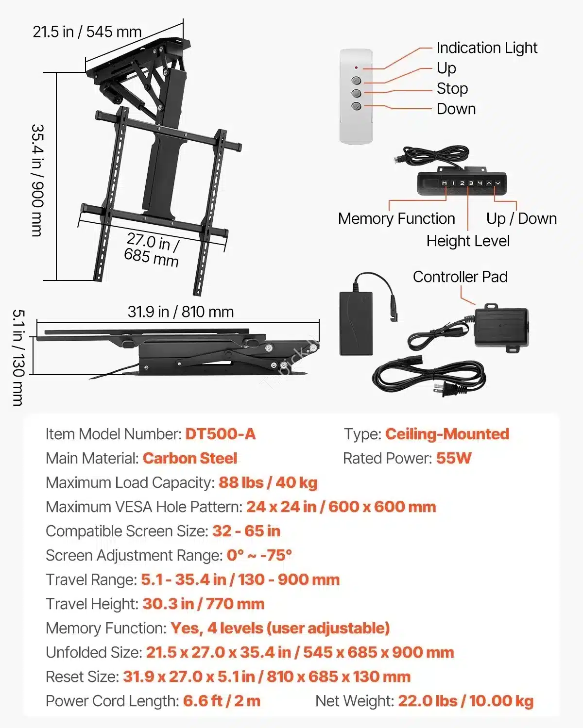3. Patikimumas ir Saugumas Laikiklis pagamintas iš tvirto milteliniu būdu dengto anglies plieno, kuris garantuoja ilgaamžiškumą ir stabilumą. Galingas variklis užtikrina sklandų ir tylų televizoriaus kėlimą ir nuleidimą.