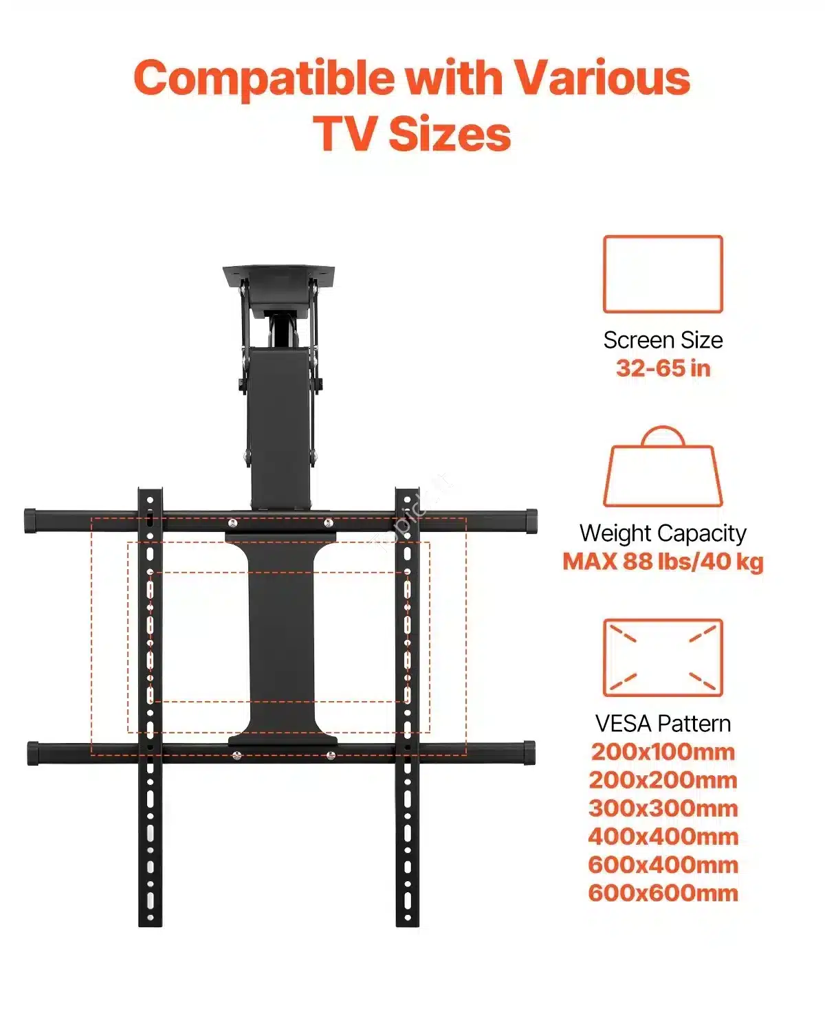 Elektrinis Motorizuotas TV Lubų Laikiklis su Nuotoliniu Valdymu, 32-65 colių (81-165 cm), 40 kg, Reguliuojamas 13-90 cm aukštis
