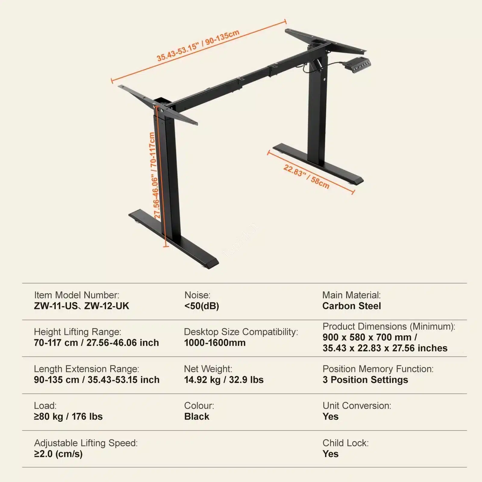 Elektrinis Reguliuojamo Aukščio Stalo Rėmas, Vieno Variklio, 80 kg, 70–117 cm Aukštis, 90–135 cm Plotis, Plienas