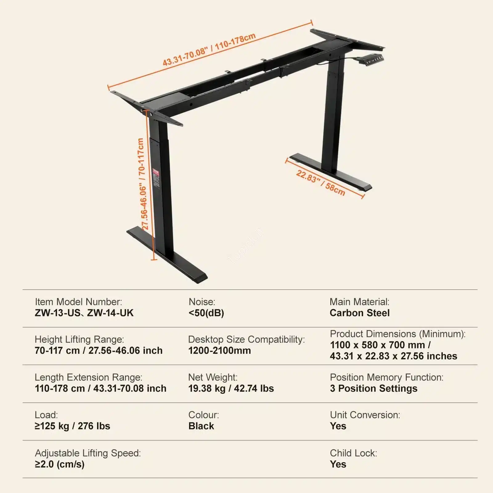 • Didesnė Erdvė: Rėmas lengvai išsitempia nuo 110 iki 178 cm, todėl ant jo be vargo uždėsi masyvų 120-210 cm pločio stalviršį. Tai idealu dideliems monitoriams, daug dokumentų ar kūrybiniam darbui.