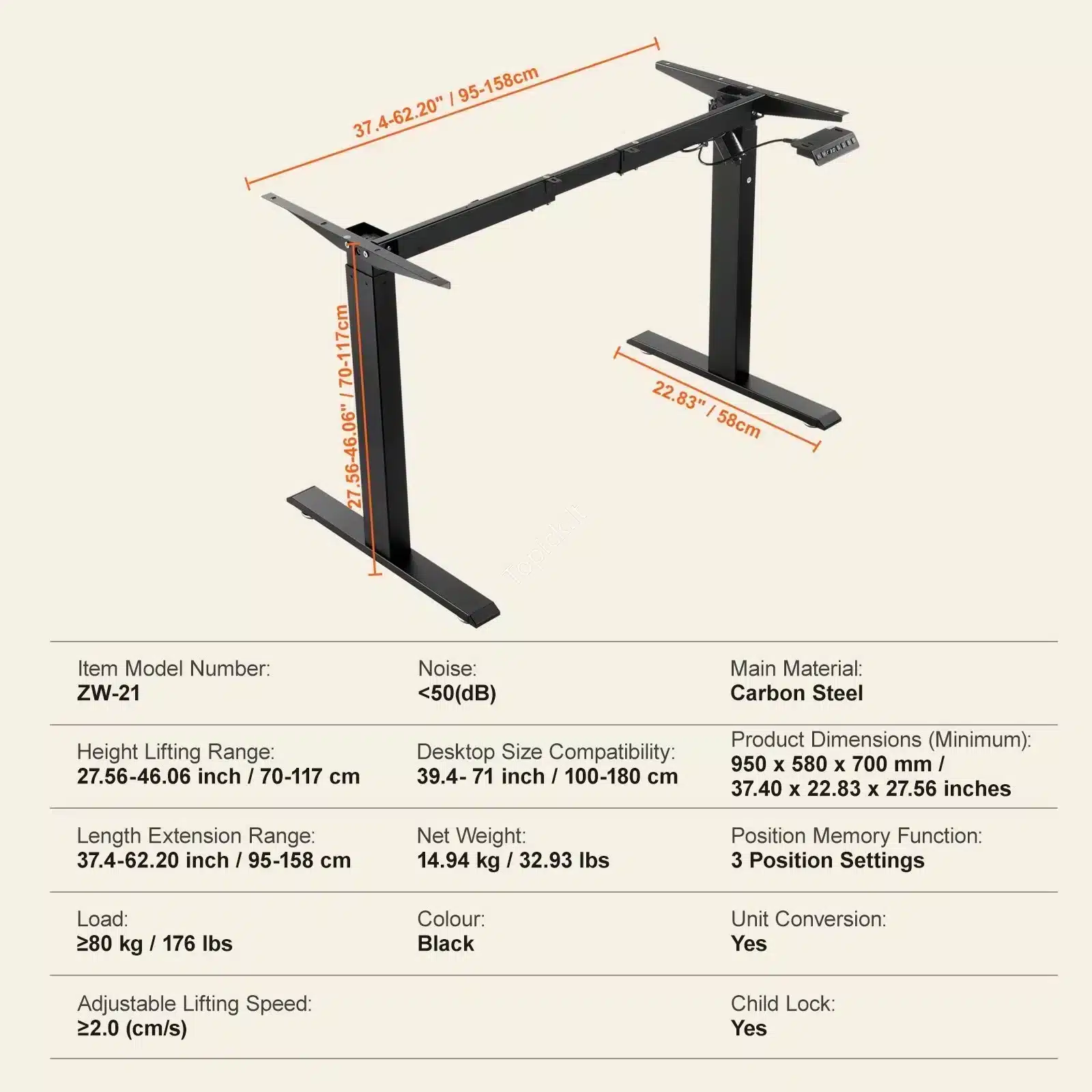 Šis juodas elektrinis stalo rėmas (70-117 cm aukštis, 95-158 cm plotis) yra puikus balansas tarp kainos, kokybės ir funkcionalumo.