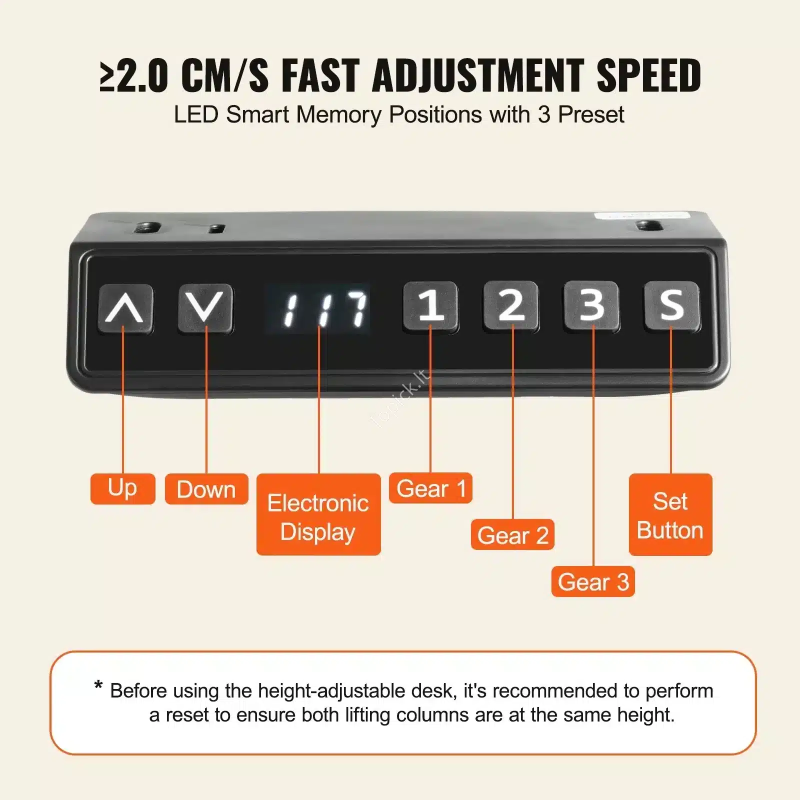 - Ergonomika: Lengvai perjunk stalo aukštį nuo 70 cm (sėdima) iki 117 cm (stovima). Aukščio atminties funkcija leidžia išsaugoti 3 mėgstamiausias pozicijas, o sėdimos veiklos priminimas pasirūpins, kad nepamirštum pajudėti.