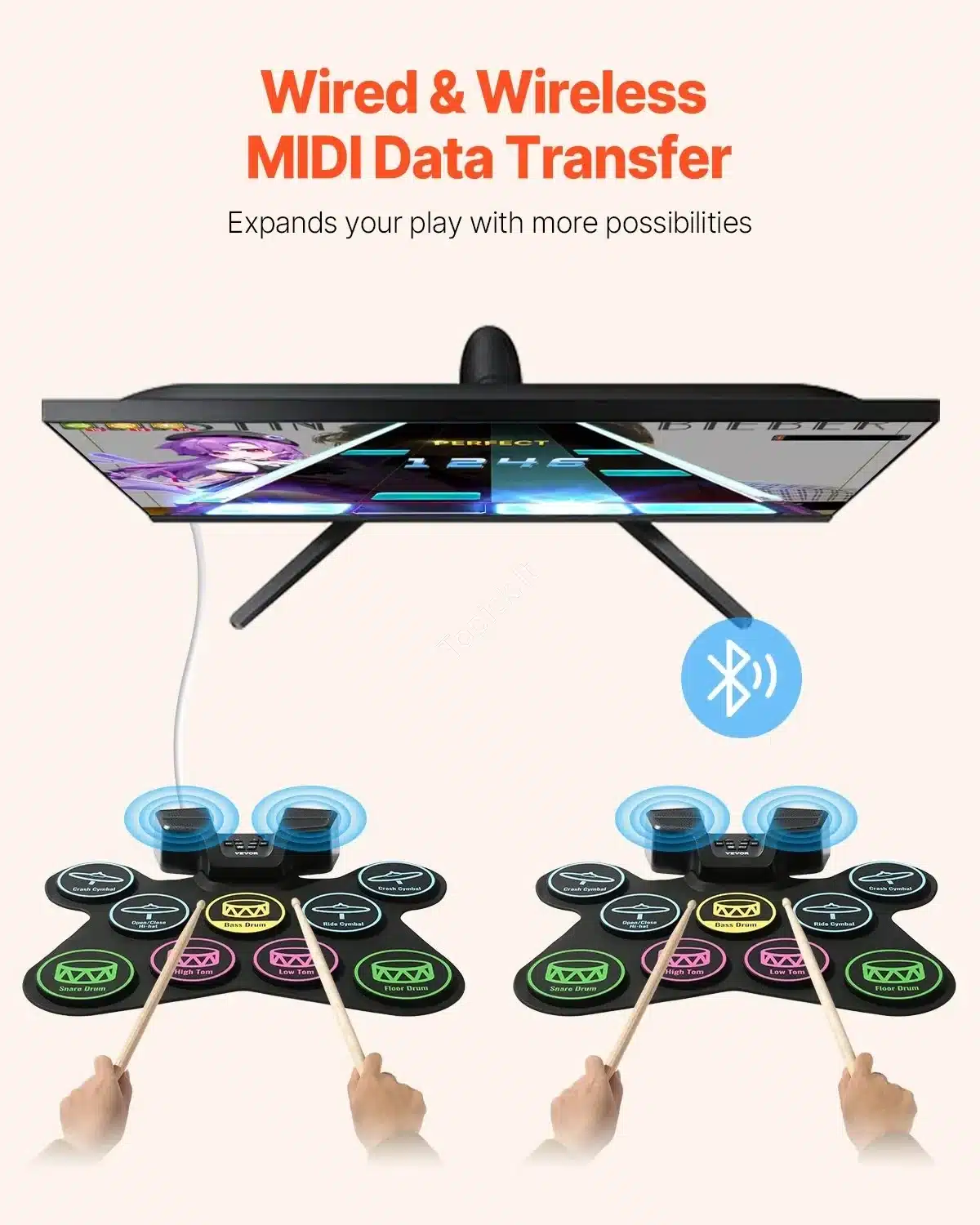 Šie būgnai leidžia rinktis iš daugiau nei 480 garsų ir 32 būgnų rinkinių, apimančių platų muzikos stilių spektrą. USB MIDI palaikymas leidžia lengvai prijungti būgnus prie kompiuterio, todėl galėsite įrašinėti, kurti ar tiesiog groti kartu su mėgstamais takeliais. Integruoti garsiakalbiai užtikrina aiškų ir galingą garsą, o galimybė prijungti ausines leidžia groti netrukdant kitiems.
