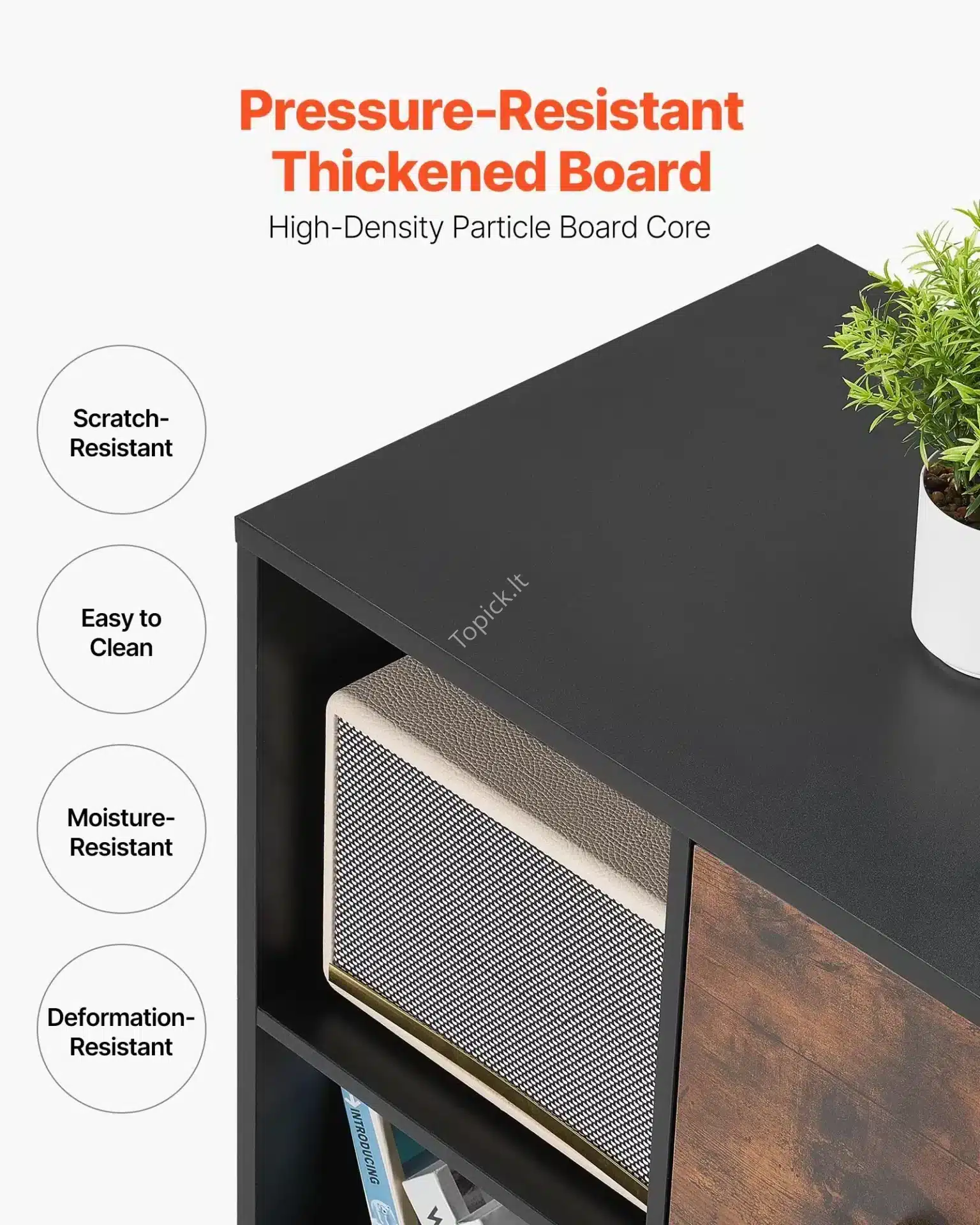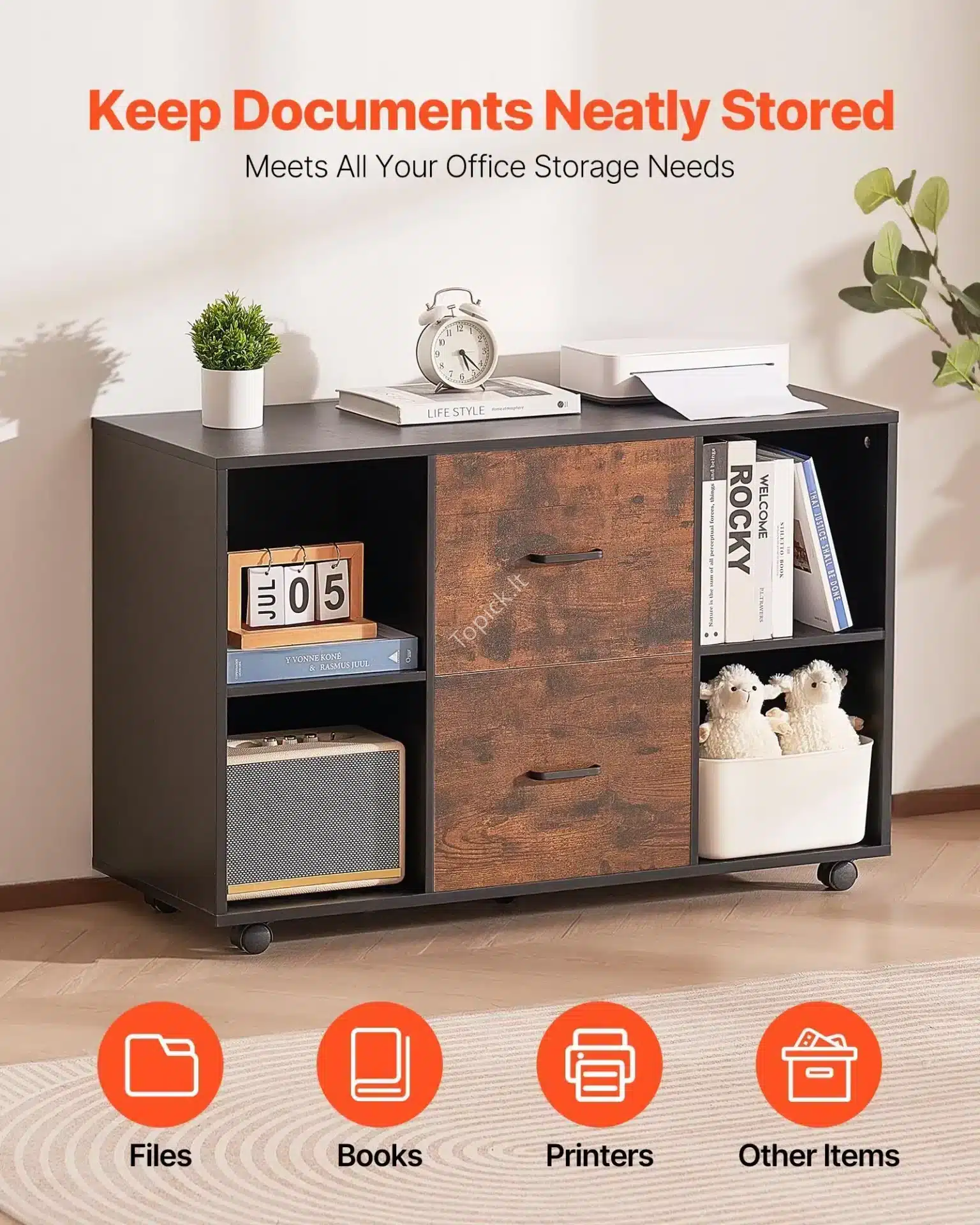 - Maksimali Darbo Erdvė: Didelis spintelės viršus (stalviršis) yra puikiai pritaikytas spausdintuvui, skeneriui ar fakso aparatui pastatyti. Taip atlaisvinsi vietą ant savo pagrindinio rašomojo stalo.