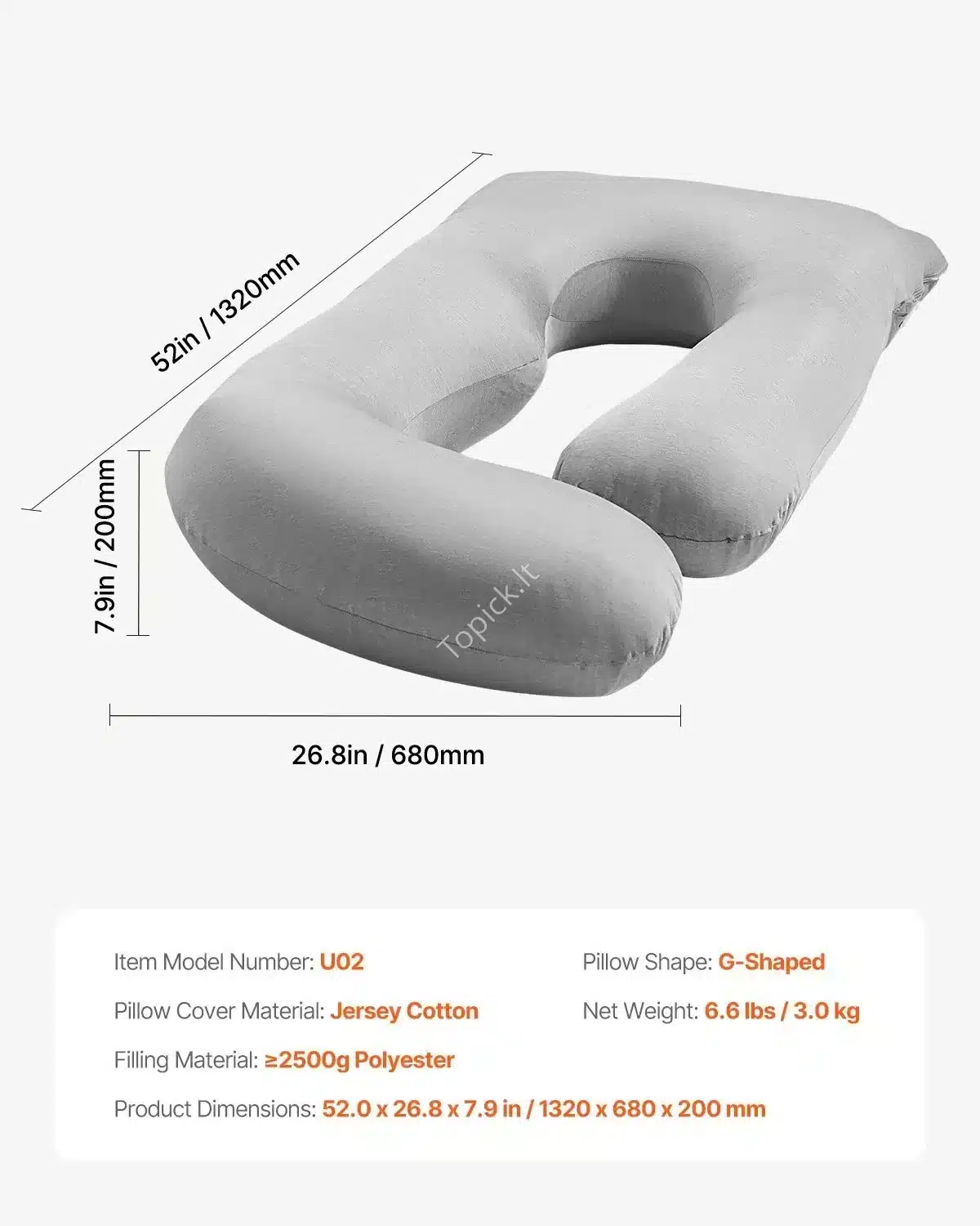 - Matmenys: Didelė pagalvės matmenys: 1320 mm x 680 mm x 200 mm (132 cm x 68 cm x 20 cm). Svoris: 3,0 kg.