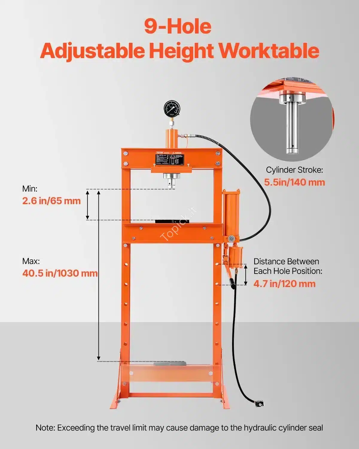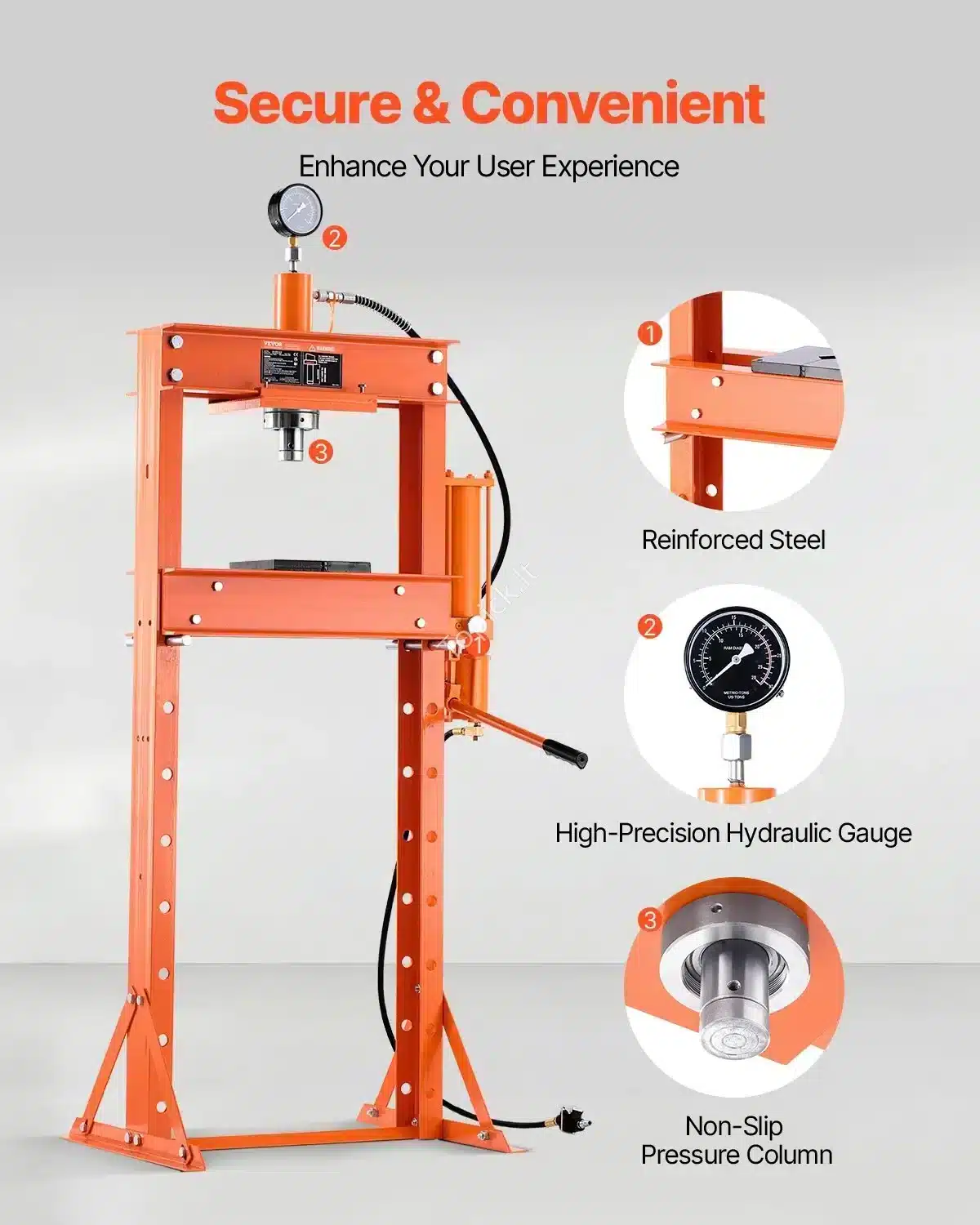 Jei 10 tonų tau jau per mažai, bet 30 tonų – dar nereikia, šitas 20 tonų hidraulinis presas yra aukso viduriukas, kuris atlaikys bet kokį sunkų darbą tavo autoservise ar gamybos ceche!