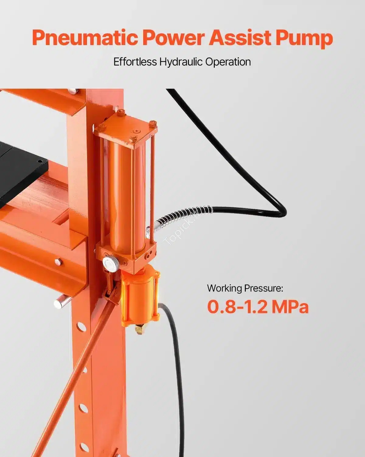 Šis presas ne tik pasižymi milžiniška 20T spaudimo jėga, bet ir siūlo dvejopą veikimą: gali spausti rankine pompa arba prijungti oro kompresorių ir dirbti pneumatiniu būdu – tai tau leis be vargo išardyti ir sumontuoti automobilio įvores, guolius, šarnyrus, kryžmines jungtis ir atlikti kitus sudėtingus metalo lenkimo ar tiesinimo darbus.