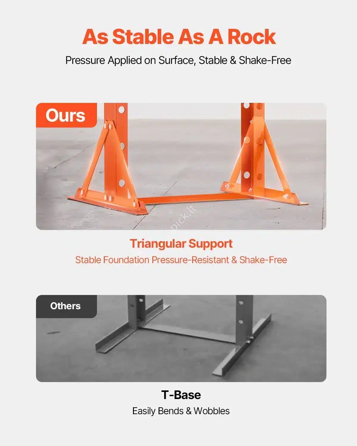 - Stabilumas ir Ilgaamžiškumas: Tvirtas H-formos rėmas, pagamintas iš storo plieno, su papildomu trikampiu pagrindo sutvirtinimu garantuoja stabilumą ir jokio klibėjimo net esant didžiausiai apkrovai.