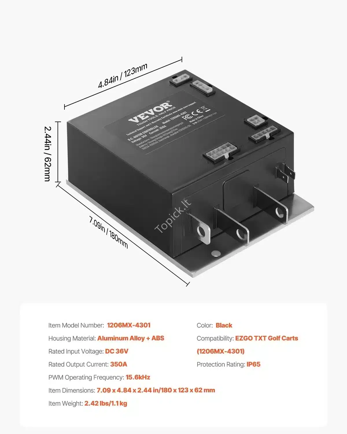 - Išėjimo Srovė: 350A (tai yra patobulinimas, lyginant su kai kuriais standartiniais 300A valdikliais, kas reiškia didesnį sukimo momentą ir galią).