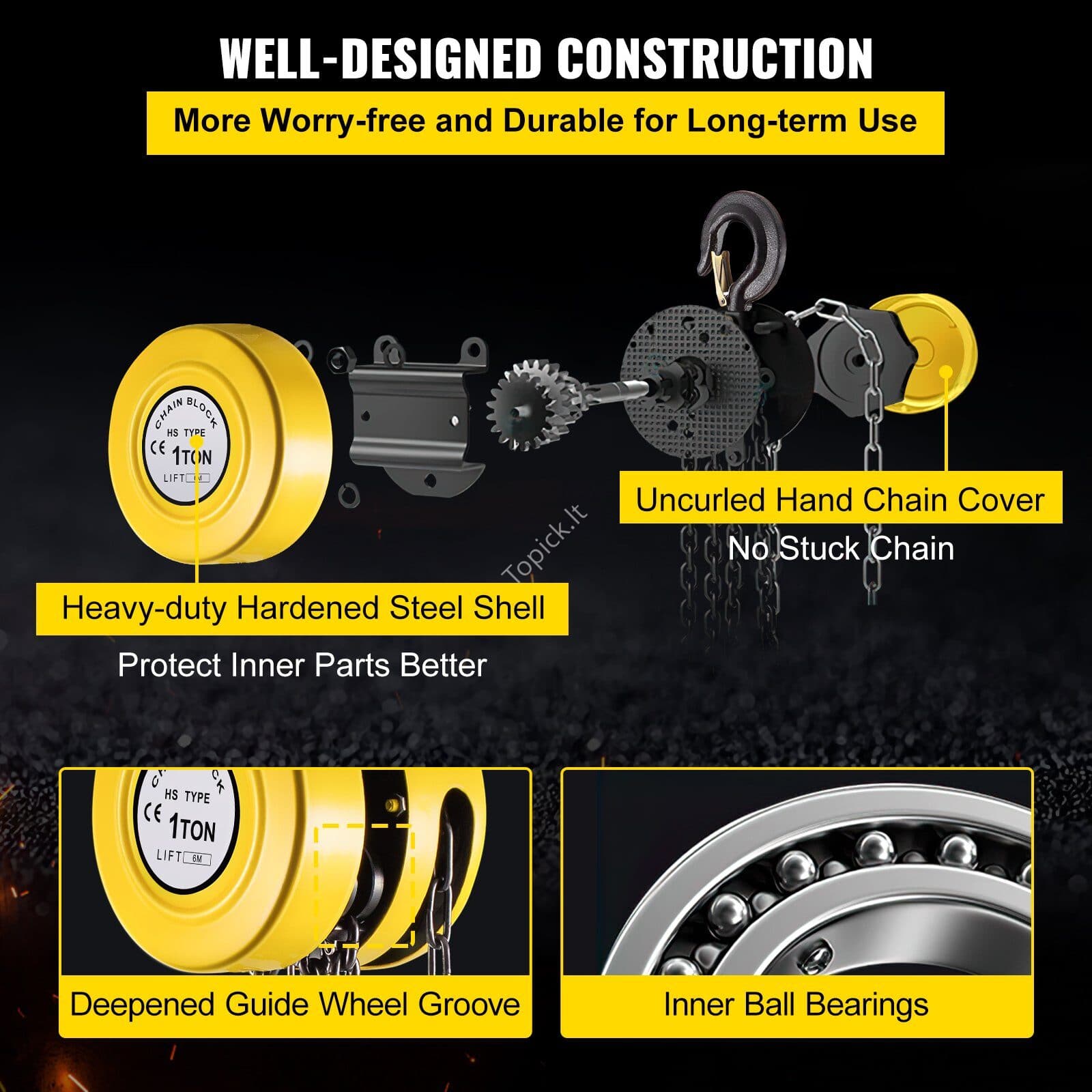 Mini rankinis grandininis keltuvas 1 t | 6 m pakėlimo aukštis | Geltonas metalinis korpusas | 360° sukiojamas kablys