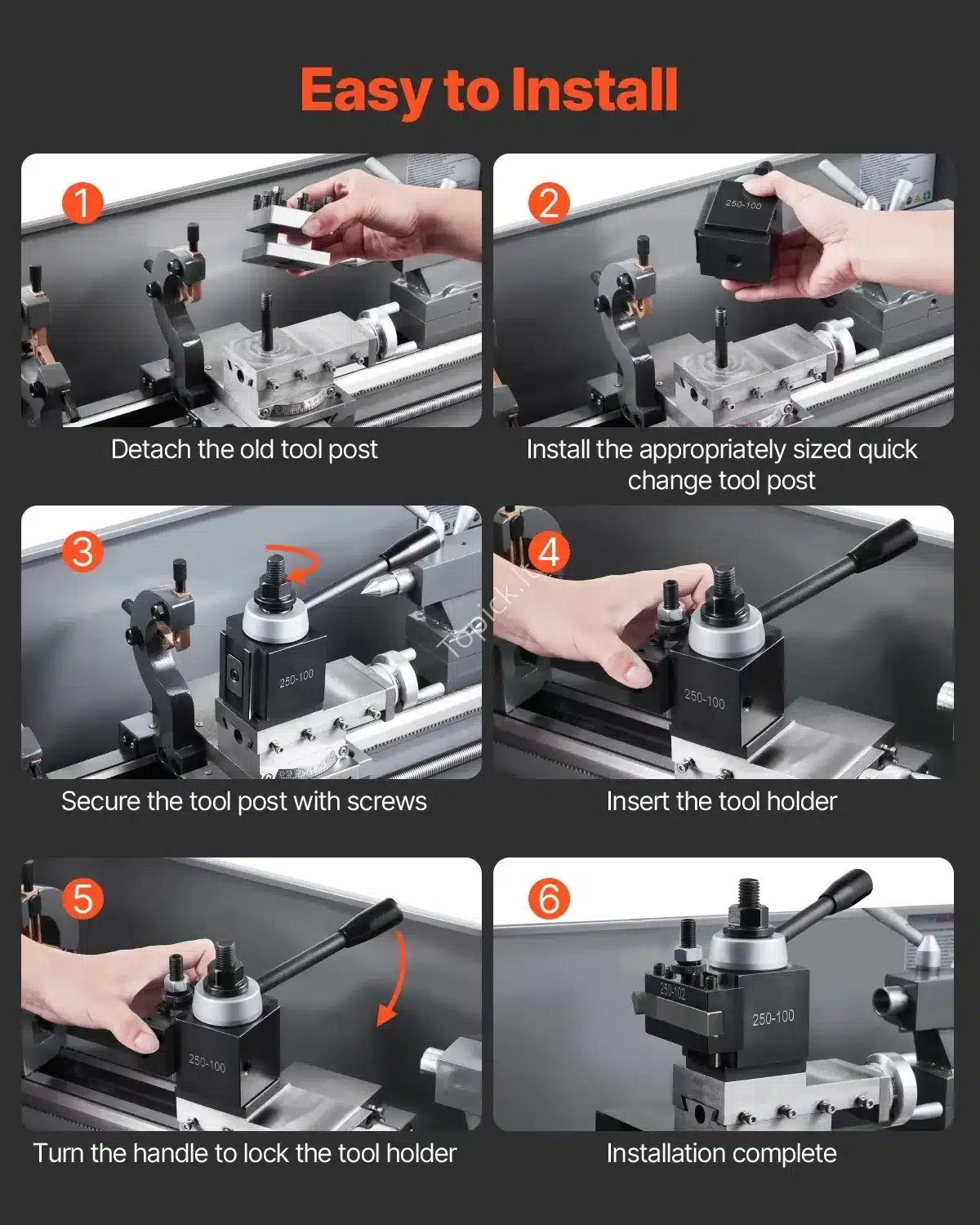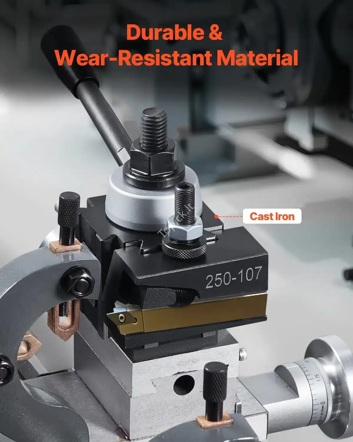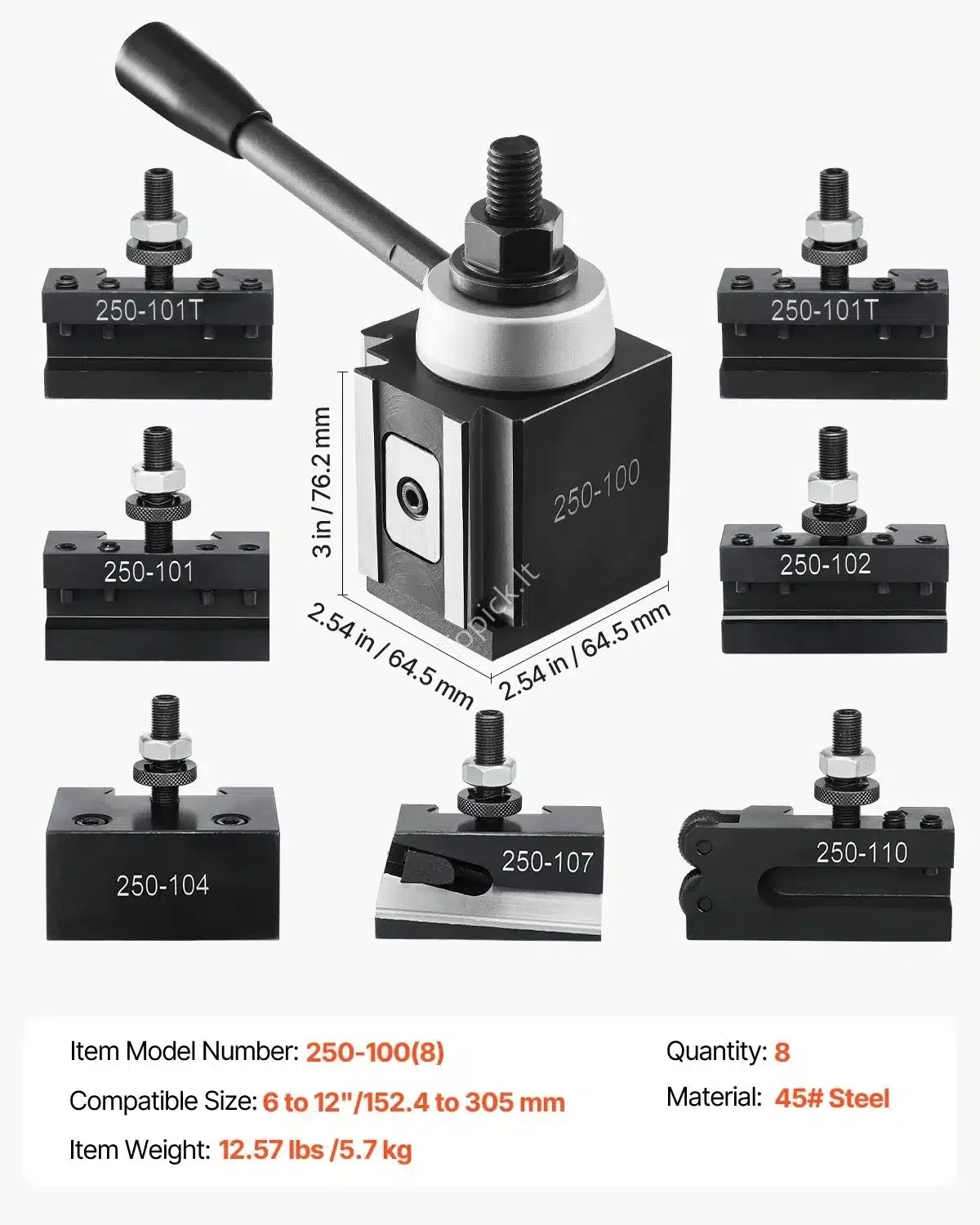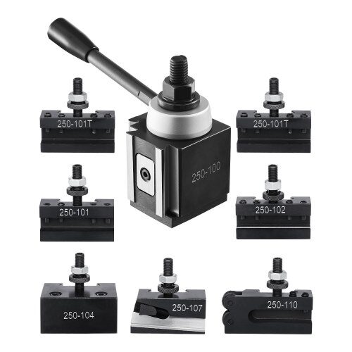 Šis 8 dalių greito keitimo įrankių laikiklių komplektas skirtas tekinimo staklėms, kurių atstumas tarp centrų yra nuo 152.4 mm iki 305 mm. Pagamintas iš tvirto ketaus, jis užtikrina ilgaamžiškumą ir stabilų veikimą. Dėl 4-jų taškų varžtų sistemos sumažinamas vibracijos poveikis, o tai padeda pasiekti aukščiausią tikslumą. Greitas keitimas leidžia supaprastinti darbą ir sutaupyti laiko.