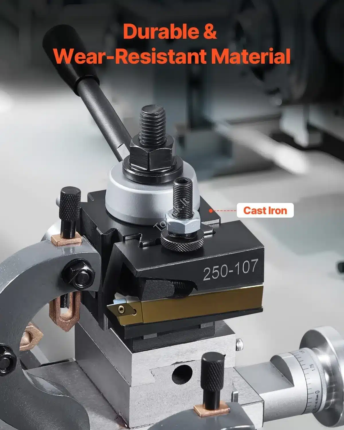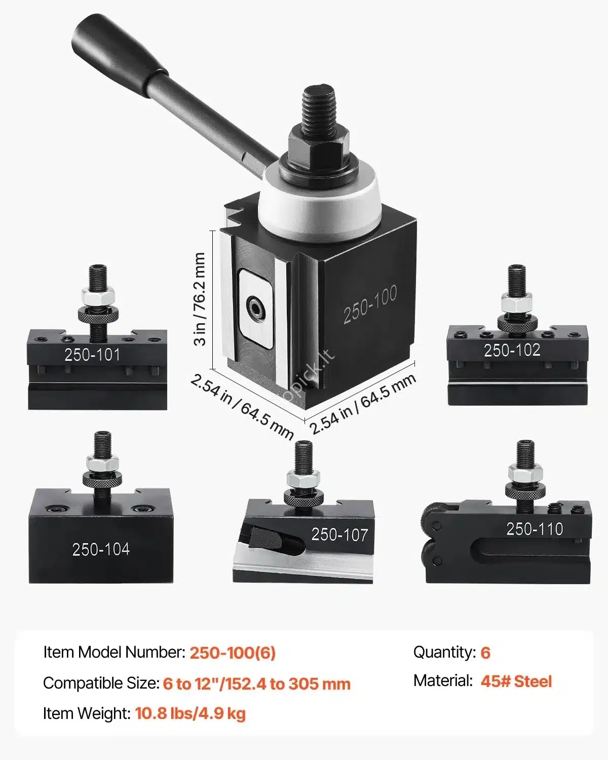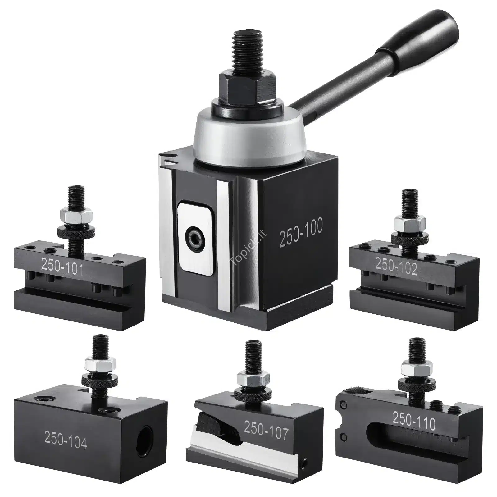 Šis 6 dalių greito keitimo įrankių laikiklių komplektas skirtas tekinimo staklėms, kurių atstumas tarp centrų yra nuo 152.4 mm iki 305 mm. Pagamintas iš tvirto ketaus, jis užtikrina ilgaamžiškumą ir stabilų veikimą. Dėl 4-jų taškų varžtų sistemos sumažinamas vibracijos poveikis, o tai padeda pasiekti aukščiausią tikslumą. Greitas keitimas leidžia supaprastinti darbą ir sutaupyti laiko.