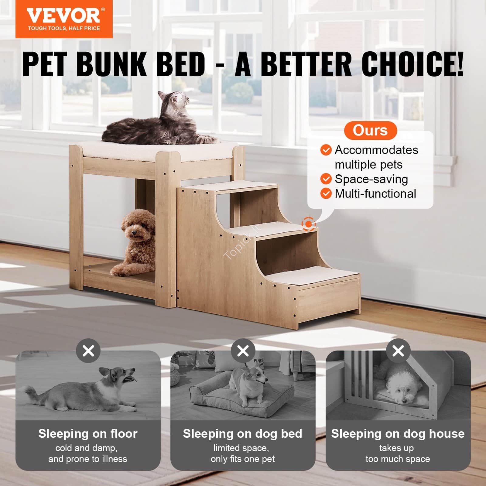 - Daugiafunkcinis dizainas: sujungiant dviaukštę augintinio lovą ir augintinio kopėčias viename, ant naminio gyvūno lango sėdynė suteikia naminiams gyvūnėliams tiek viršutinę, tiek apatinę dvigubą poilsio vietą, leidžiančią augintiniams pasirinkti, kur jie nori ilsėtis. Taip pat galima vienu metu apgyvendinti 2 ar daugiau augintinių, taip sutaupant vietos. Gyvūnų kopėčios gali būti naudojamos atskirai. Kopėčios leidžia augintiniams lengvai lipti aukštyn ir žemyn, išvengiant dažno šokinėjimo poveikio sąnariams.