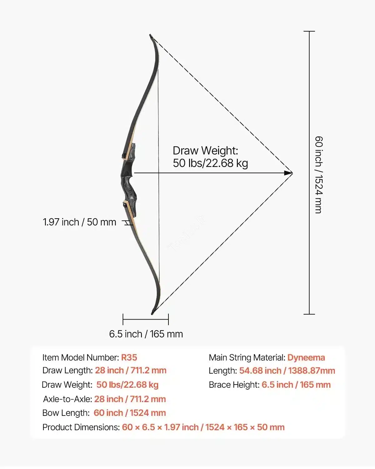 Išardomas Medinis Recurve Lankas (Takedown Recurve Bow), 1524 mm, 22,68 kg Tempimo Jėga, Dešiniarankiams, Su Pilnu Šaudymo Rinkiniu 🏹🌲🎯
