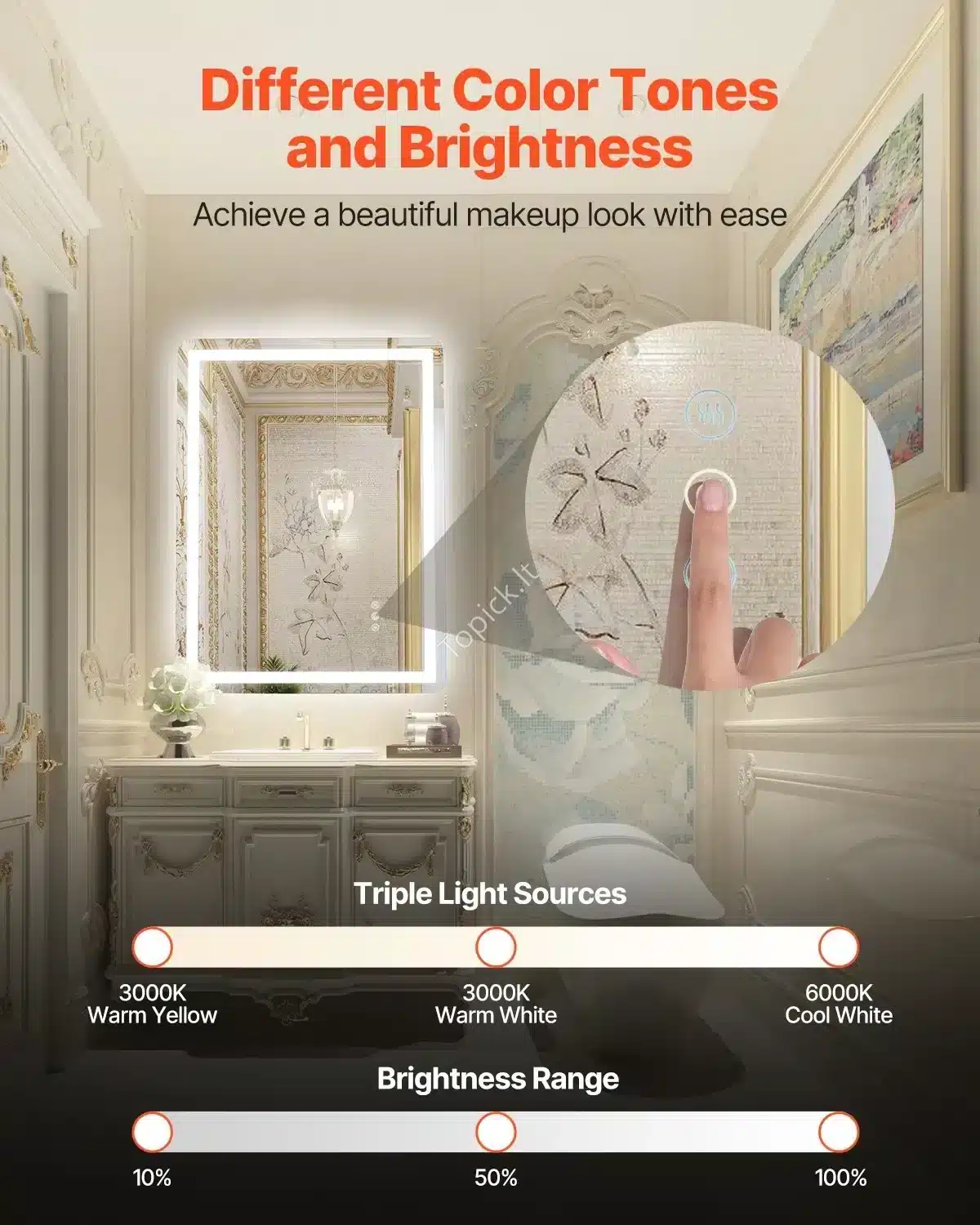 Išmanusis LED Vonios Veidrodis su Apšvietimu 💡 60 x 80 cm, 3 Šviesos Spalvos, Reguliuojamas Ryškumas, Apsauga nuo Rasojimo, Montuojamas ant Sienos