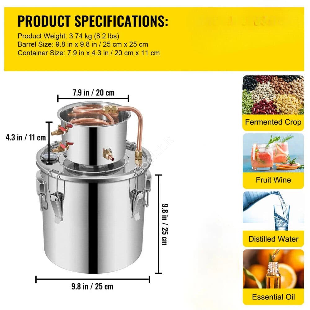 Įvairių stipriųjų gėrimų ir vandens distiliatorius – 12 L – Kompaktiška nerūdijančio plieno ir vario sistema 🍶🔥