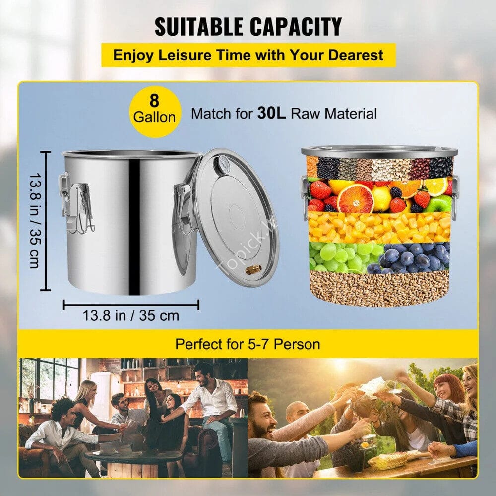 Šis distiliatorius turi 19 litrų (5 Gal / ~19 L) fermentavimo talpą, puikiai tinkamą šeimos šventėms ar mažesnėms gamybos partijoms.
