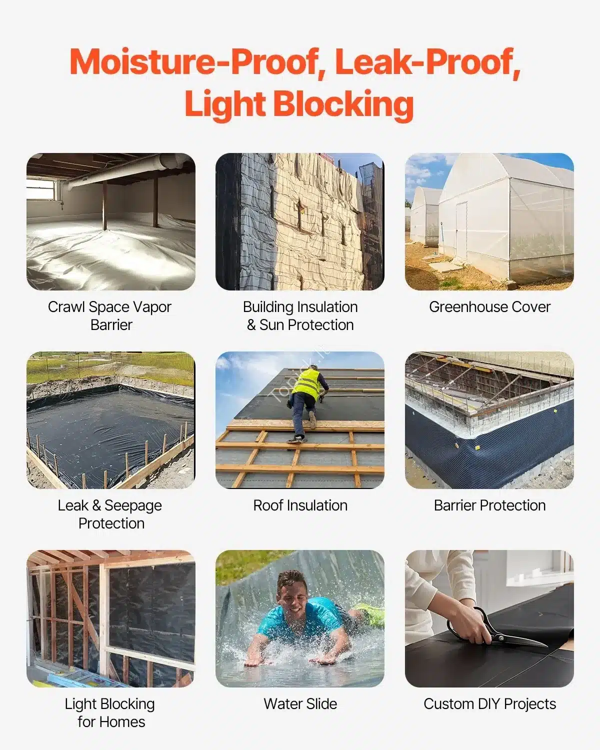 • Universalumas: Tinka naudoti kaip garų barjeras po grindimis ar pamatais, apsauginė danga statybvietėse, ar tiesiog kaip danga įvairiems paviršiams.