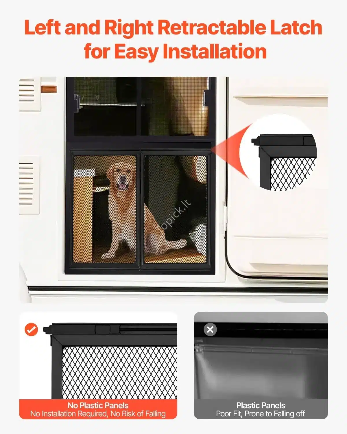 Šis tvirtas RV durų tinklelis nuo vabzdžių yra puikus sprendimas naminių gyvūnų augintojams. Pagamintas iš lengvo, bet itin tvirto aliuminio lydinio, padengto emalio danga, jis patikimai apsaugo nuo vabzdžių ir yra atsparus gyvūnų subraižymams.