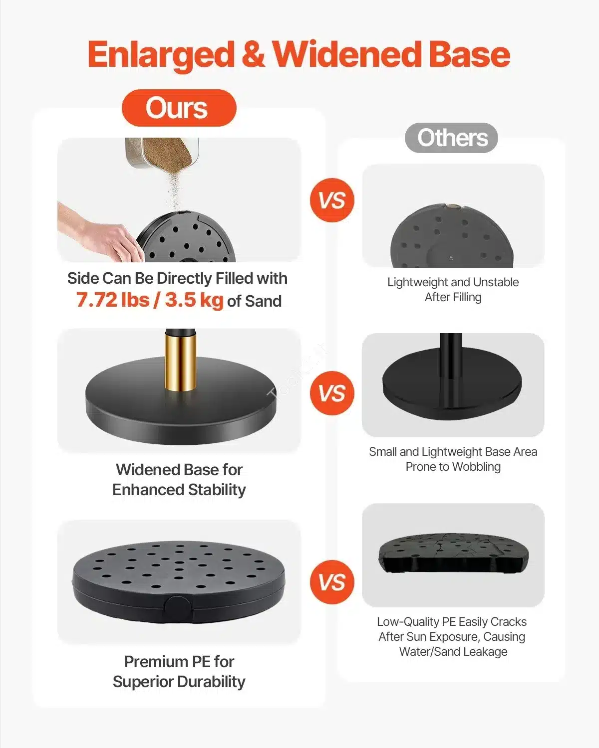 - Tvirtumas: Platus, neslystantis pagrindas gali būti užpildytas smėliu (iki 3.5 kg), užtikrinant išskirtinį stabilumą.