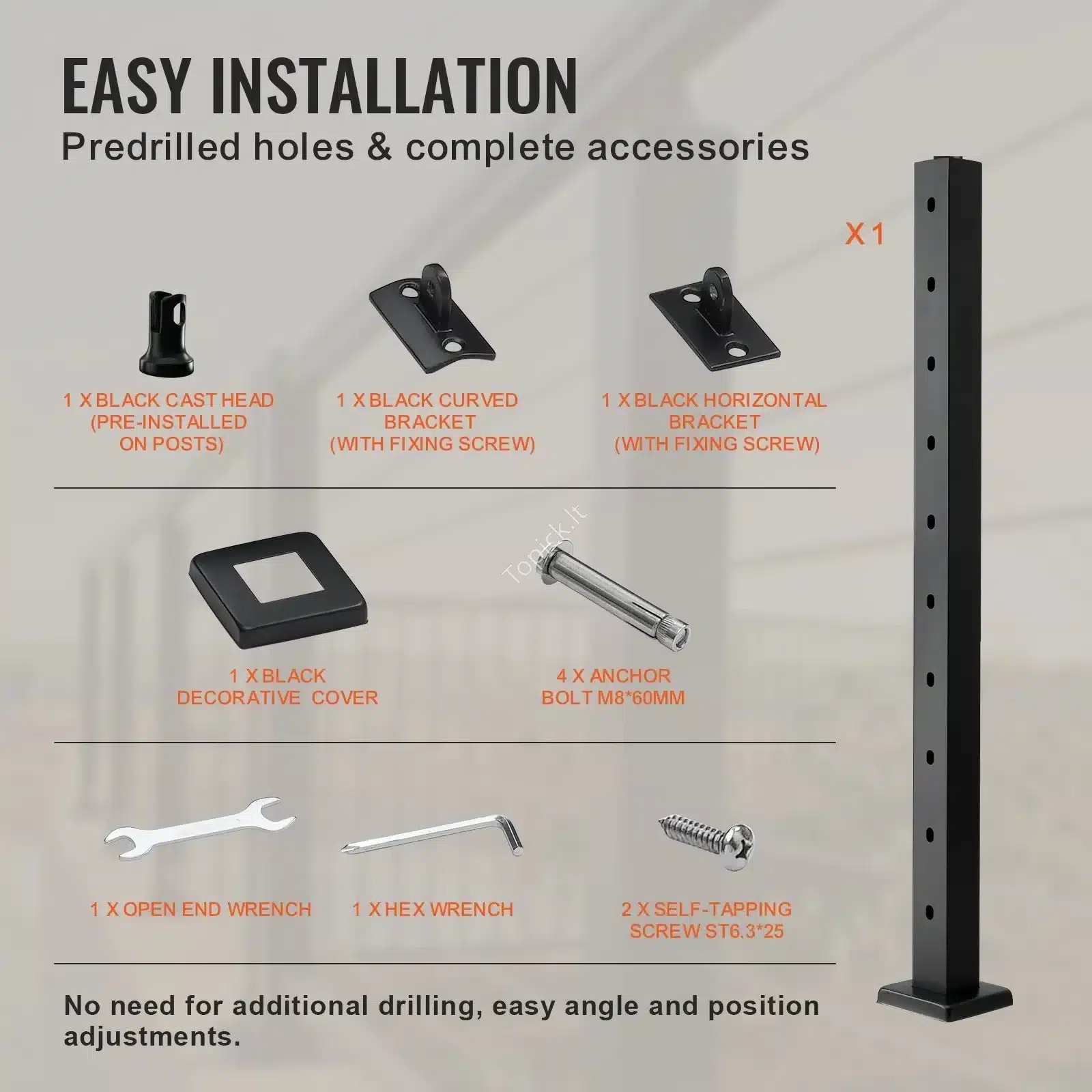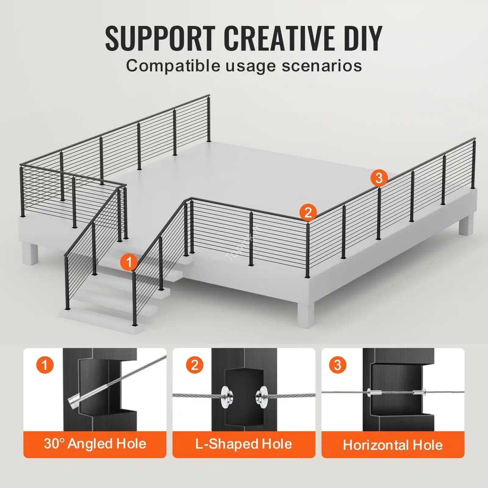 Turėklų stulpelyje įrengtas 30° kampu išlenktas skylės išdėstymas – tai leidžia lengvai pritvirtinti turėklus įvairiais kampais ir pritaikyti pagal jūsų poreikius.