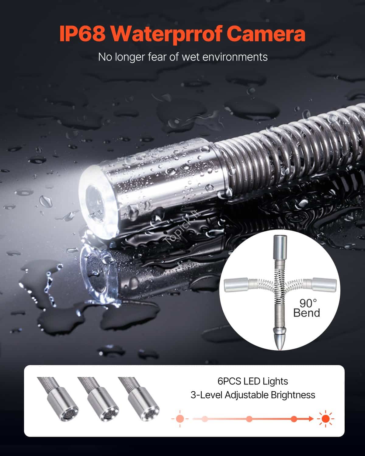 - Reguliuojamas ryškumas: ši IP68 vandeniui atspari vamzdžių tikrinimo kamera turi 6 reguliuojamus LED žibintus su 3 reguliuojamais ryškumu, kad atitiktų skirtingas apšvietimo sąlygas tamsiuose kanalizacijos vamzdžiuose. Tiesiog pasukite rankenėlę, kad sureguliuotumėte ryškumą, kad būtų užtikrintas aiškus sudėtingų ir sunkiai pasiekiamų vamzdžių sistemų vaizdas.
