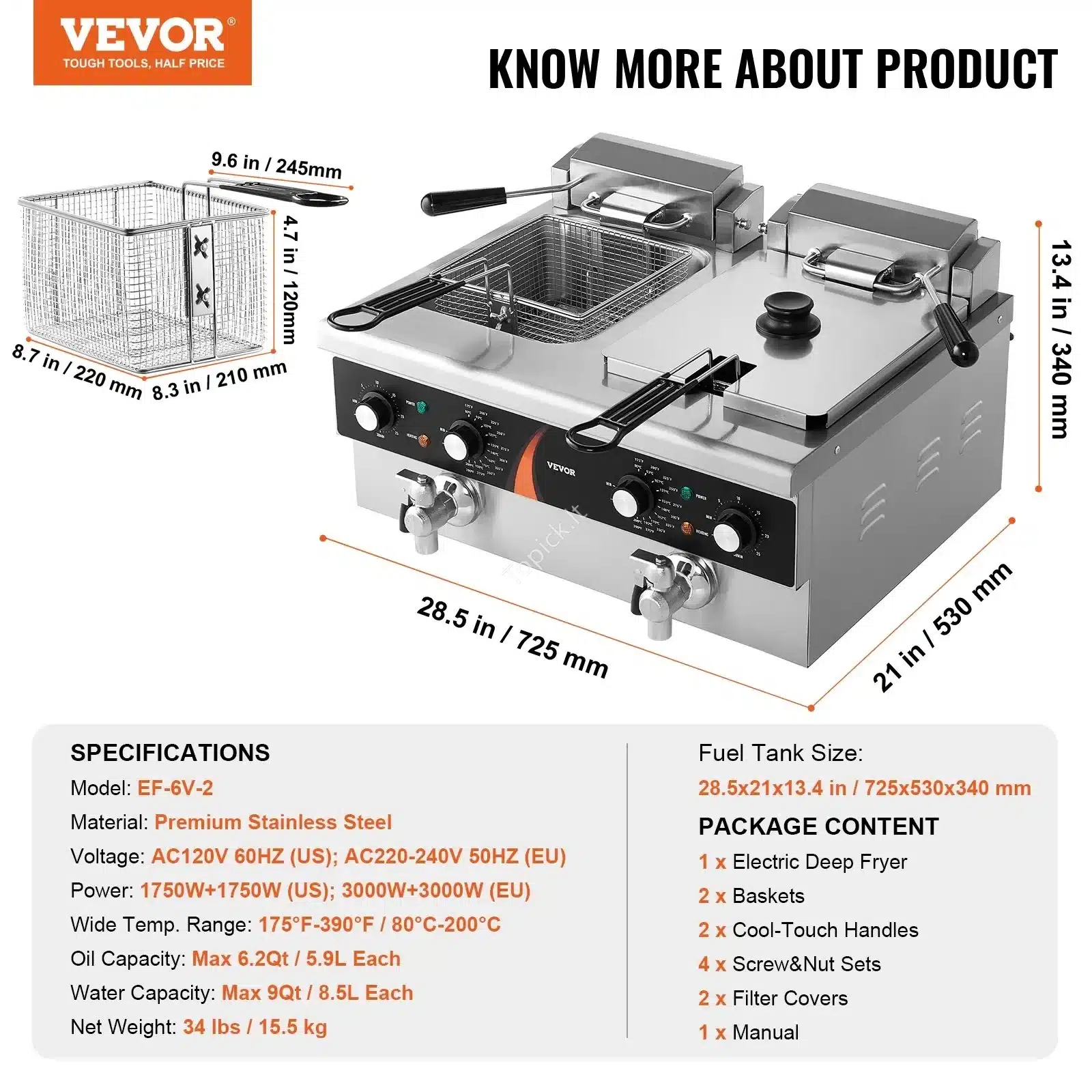 🍟 Didelė talpa ir galia – Ši komercinė elektrinė gruzdintuvė su dviem talpyklomis leidžia vienu metu gaminti didelį kiekį skirtingų patiekalų. Kiekviena talpykla talpina iki 5,9 l aliejaus, o bendras talpyklų tūris siekia 12 l.