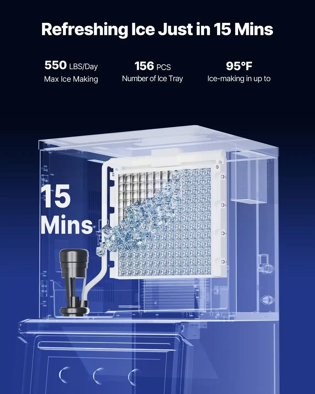 • 250 lbs (~113 kg) talpa, leidžia laikyti didelį kiekį ledo vienu metu.