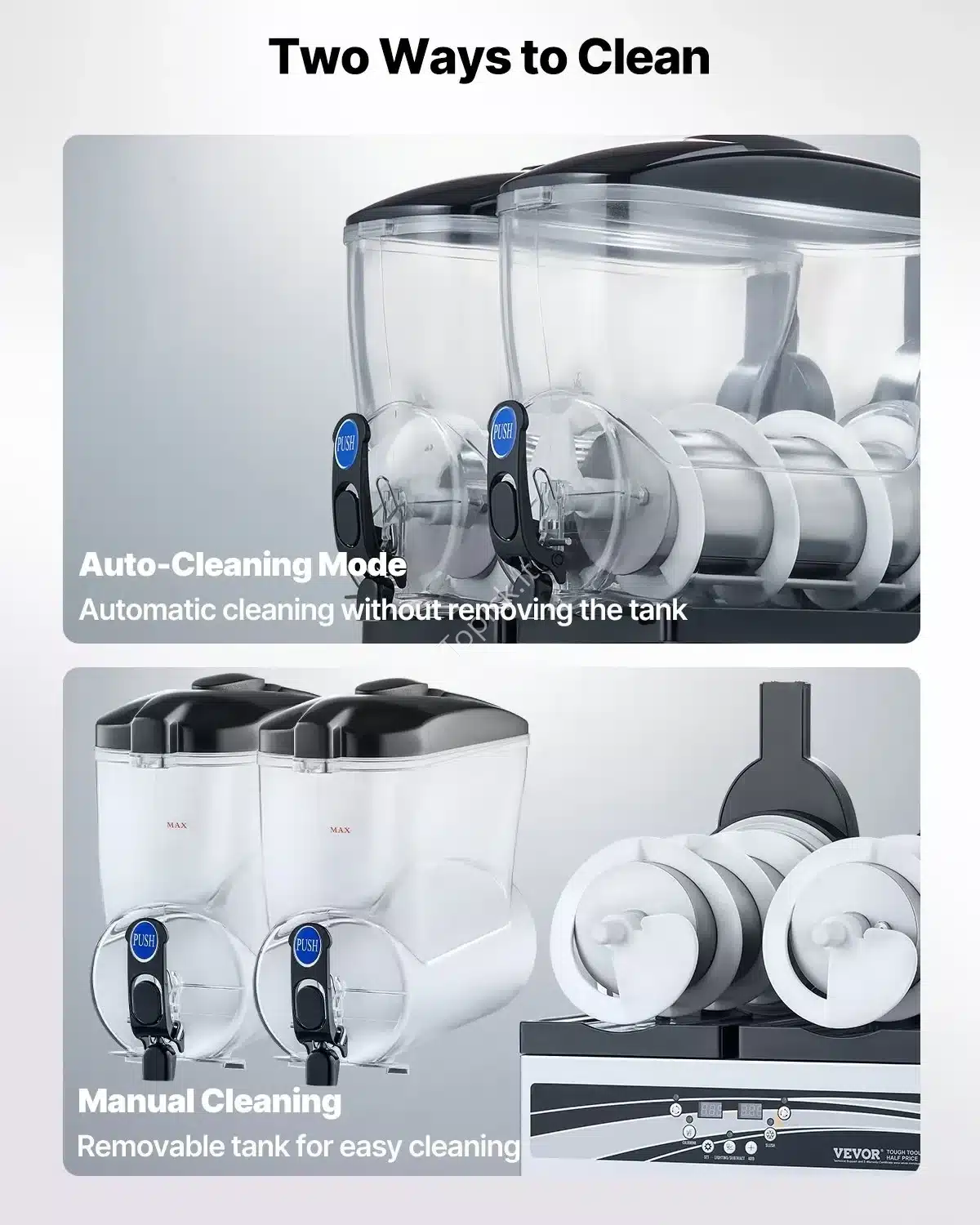 Įrenginys turi 2 nepriklausomus bakelius po 15 l (viso 30 l), todėl galima vienu metu ruošti net du skirtingus gėrimų skonius. Vienas aparatas – dvigubos galimybės!