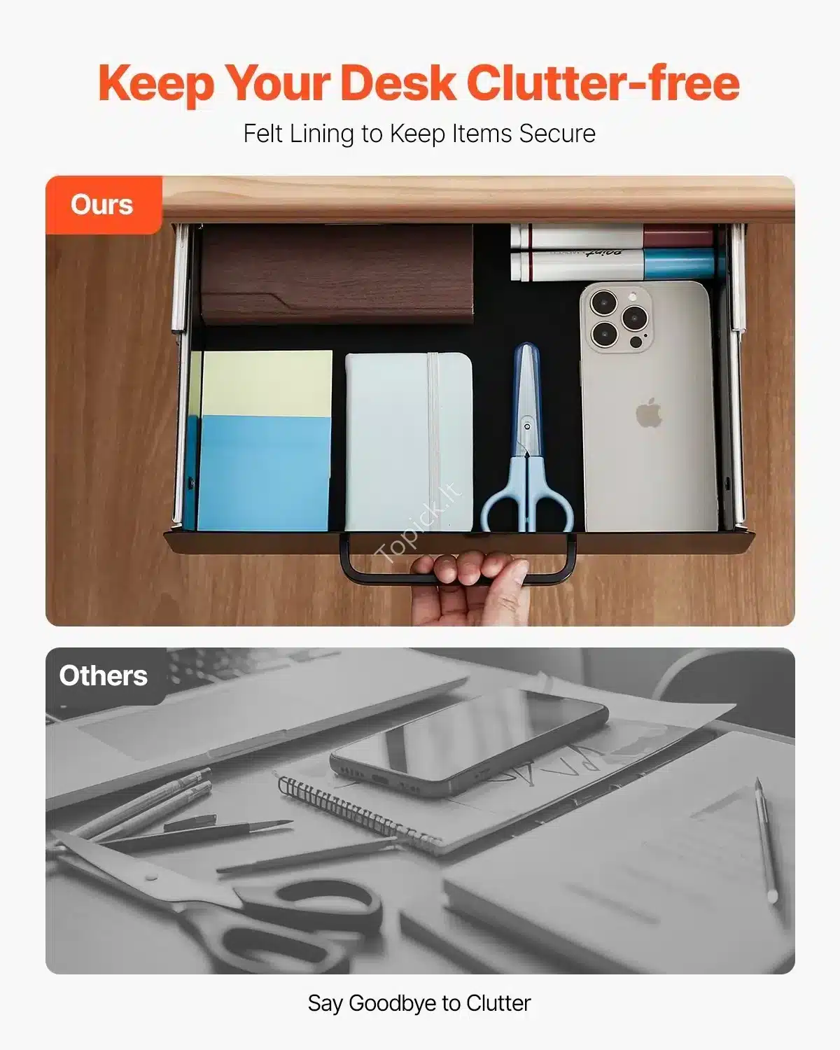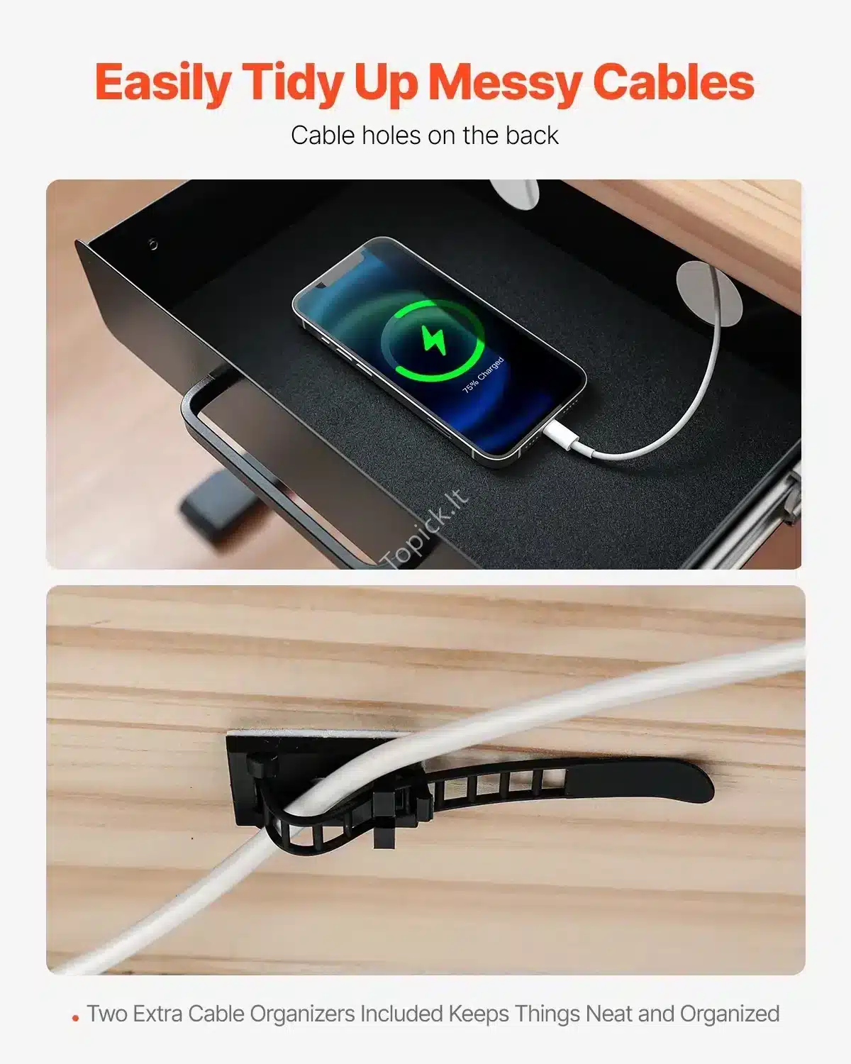 - Tvarka be Pastangų: Stalčius sumontuojamas po stalu, todėl visos smulkmenos bus paslėptos ir po ranka. Puikiai tinka rašymo priemonėms, telefonams, krovikliams ir kitiems būtiniems daiktams.