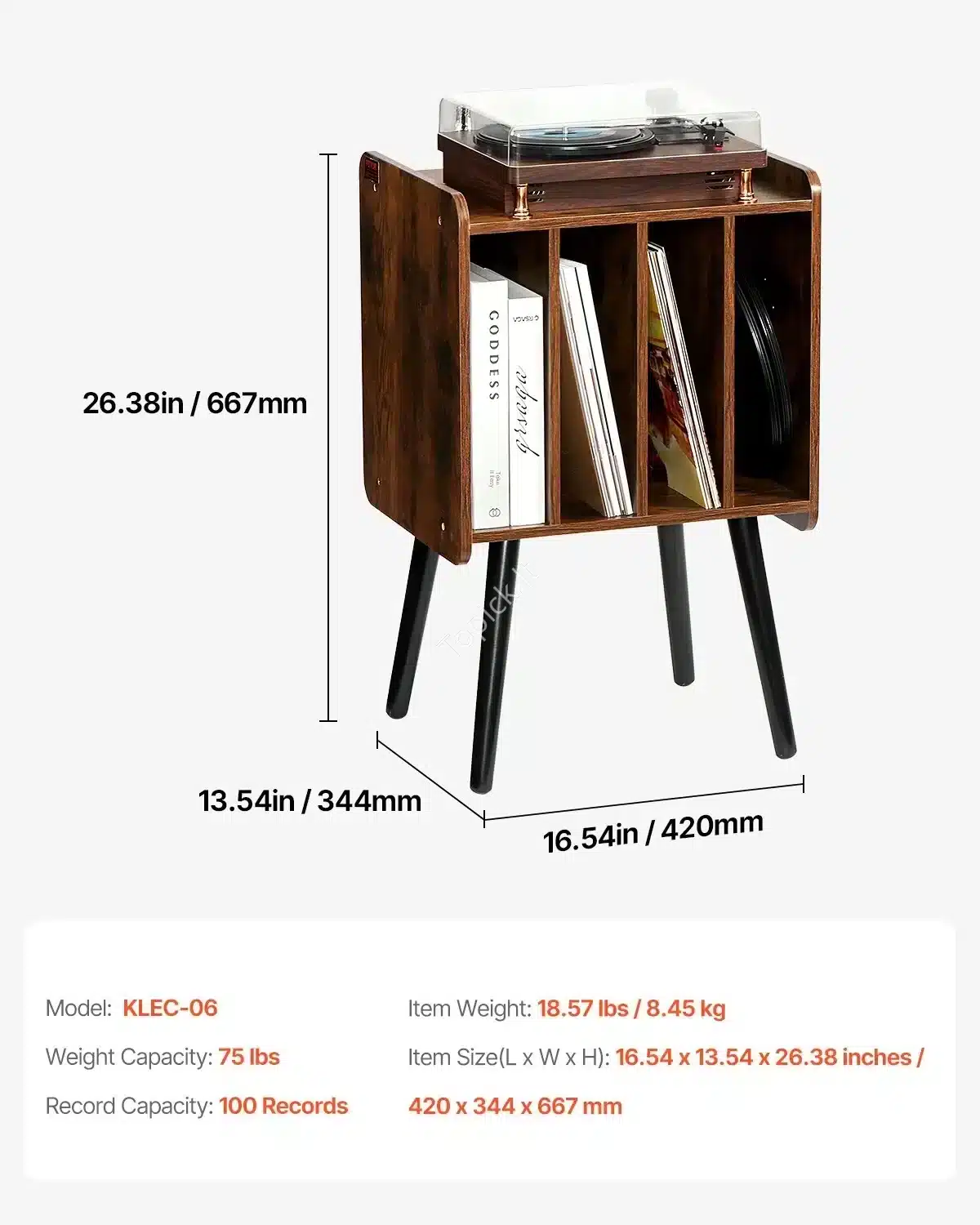 - Patikima Medžio Konstrukcija: Stovas pagamintas iš patvarių, įbrėžimams atsparių medžio plokščių ir stovi ant tvirtų medinių kojų. Stabili konstrukcija atlaikys iki 34 kg svorio, tad tavo grotuvas bus saugus.