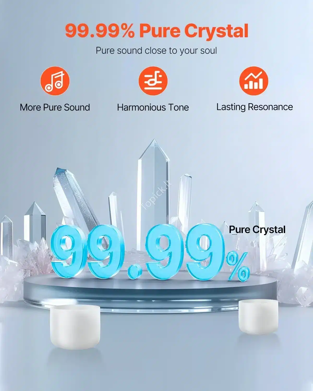 - Aukščiausia Kokybė: Dubenys pagaminti iš 99,99 % gryno kvarco krištolo su matiniu paviršiumi. Tai užtikrina krištolo skaidrumo tonus ir ypač ilgai trunkantį rezonansą, kurio vibracijos prasiskverbia gilyn į kūną.