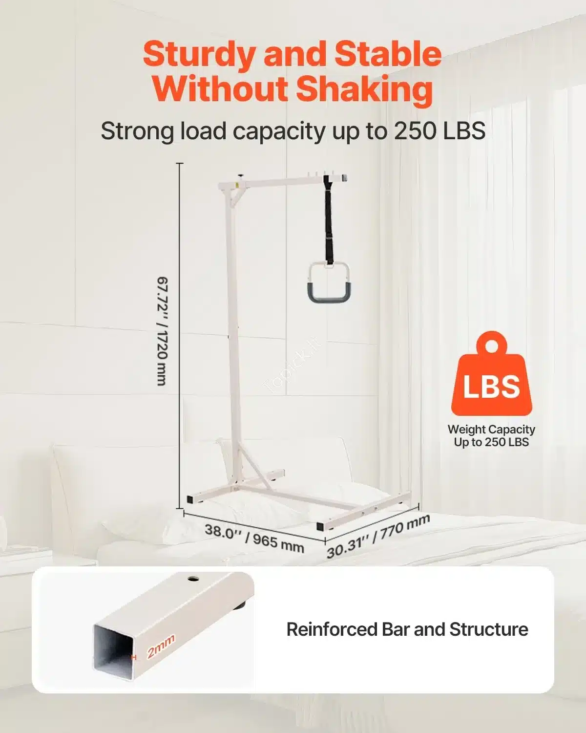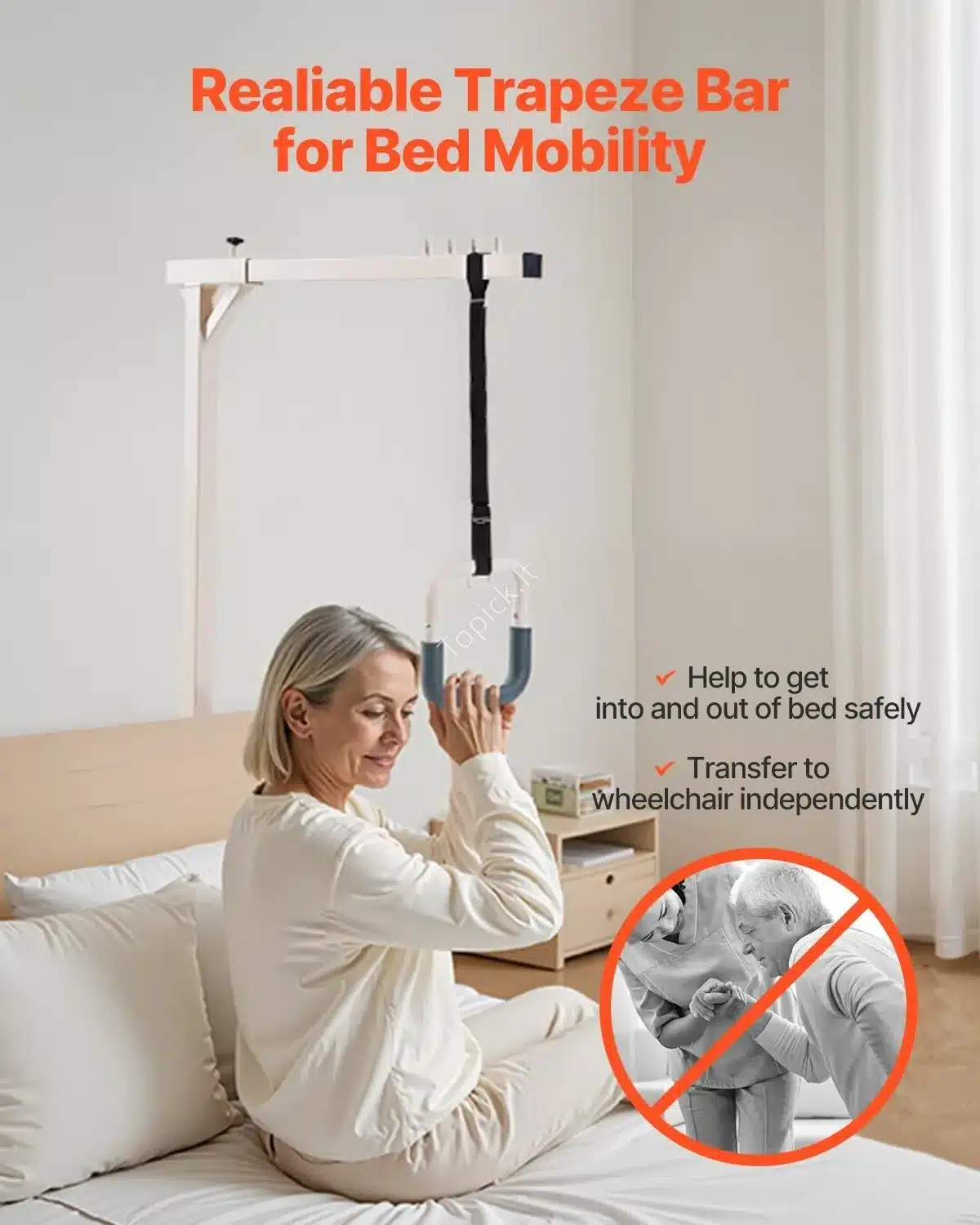 Ieškote patikimos ir stabilios pagalbos priemonės, palengvinančios judėjimą? Mūsų laisvai pastatomas paciento pakėlimo rėmas yra puikus pasirinkimas senjorams, neįgaliems asmenims, besilaukiančioms moterims ir visiems, turintiems ribotą judumą. Ši trapecija padeda saugiai atsisėsti, atsistoti ir persikelti iš lovos.