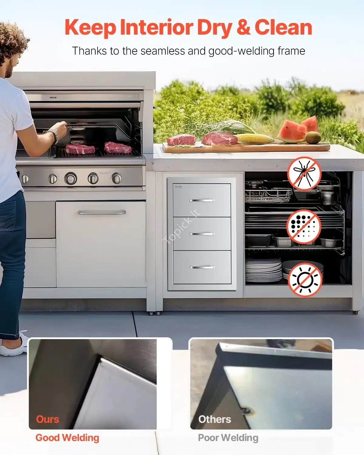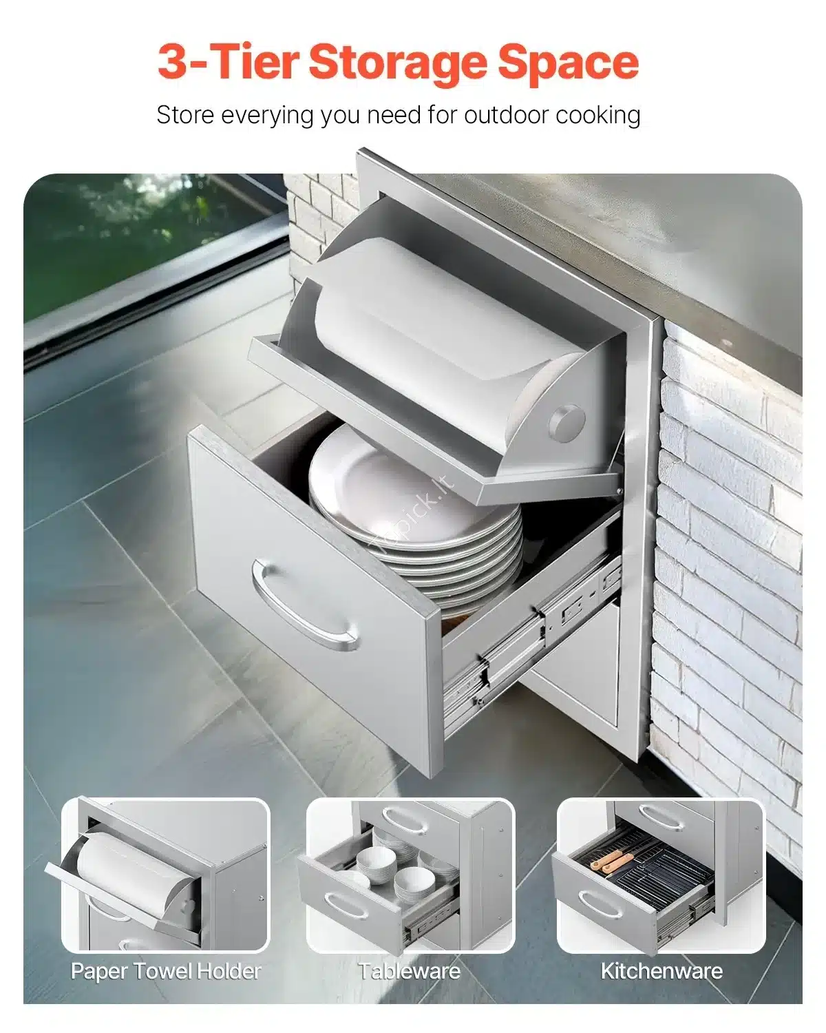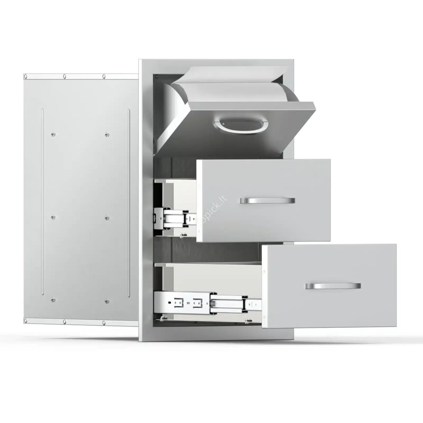 Ieškote sprendimo, kaip tvarkingai ir funkcionaliai įrengti lauko virtuvę? 🤩 Šis lauko virtuvės stalčių komplektas yra puikus pasirinkimas! Jis idealiai tinka laikyti grilio priedus, įrankius ar kitus reikmenis, o dėl tvirtos konstrukcijos jūsų daiktai bus apsaugoti nuo korozijos ir drėgmės. 💦