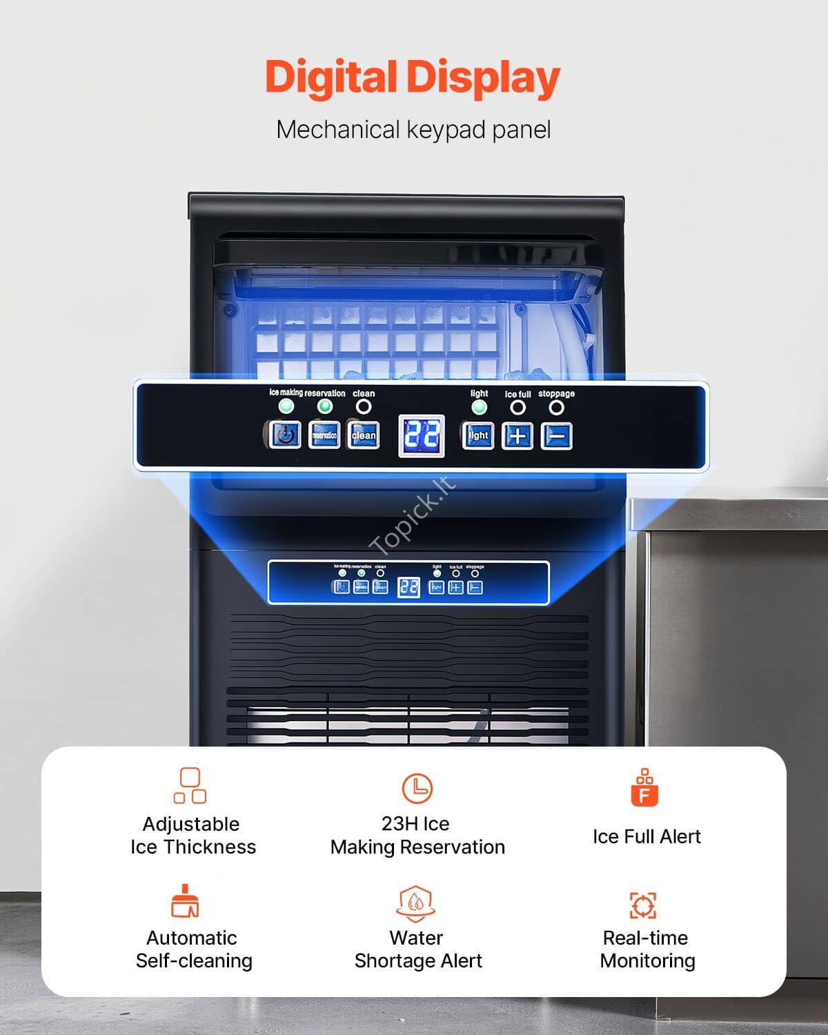 - Išmanusis valdymo skydelis: mūsų komerciniame ledo gaminimo aparate yra skaitmeninis LED ekranas ir mechaniniai mygtukai, leidžiantys tiksliai valdyti ledo gaminimo procesą. Ledo storį galite reguliuoti lengvai padidindami arba sumažindami ledo gaminimo laiką. Ir tai dar ne viskas – ledų gaminimo aparatas taip pat turi automatinio valymo funkciją, kuri palengvina įrenginio priežiūrą. Patogumas ir valdymas viename įrenginyje.