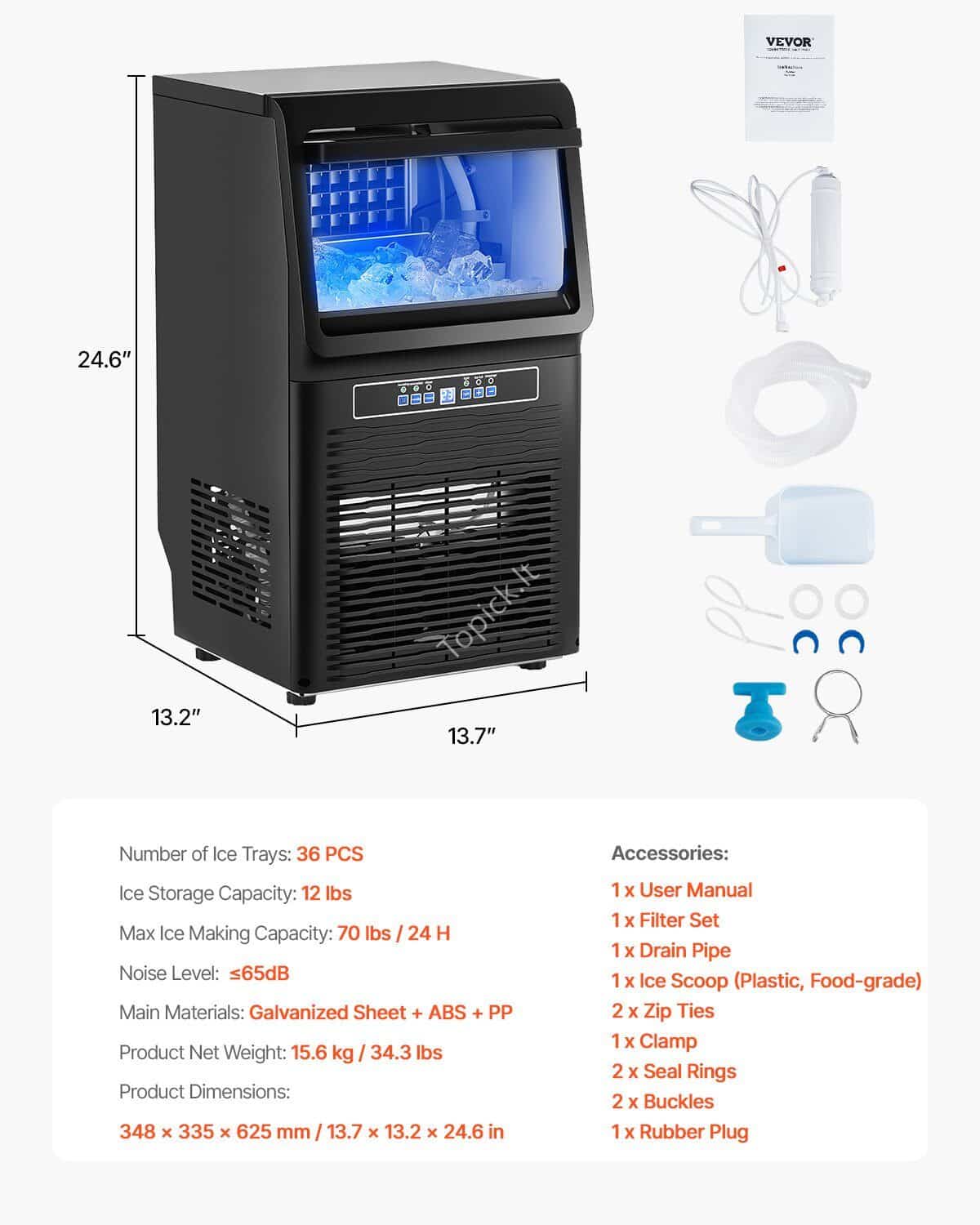 - Lengvas komercinis ledo gaminimo aparatas: mūsų komerciniame ledo gaminimo aparate yra 36 ledo kubeliai ir jis per dieną gali pagaminti iki 34 kg ledo (išbandyta nuo 41 iki 100,4 °F / 5–38 °C temperatūros diapazone). Esant realioms bandymų sąlygoms, ledo gamybos pajėgumas yra iki 34,5 kg / 24 h esant 70 ℉ (21 ℃), 50 ℉ (10 ℃) aplinkos / vandens temperatūrai. Šis kompaktiškas ledų gaminimo aparatas turi didelę 12 svarų (5,6 kg) talpą ir puikiai tinka jūsų namuose, kavinėje, bare, alkoholinių gėrimų parduotuvėje ar restorane.