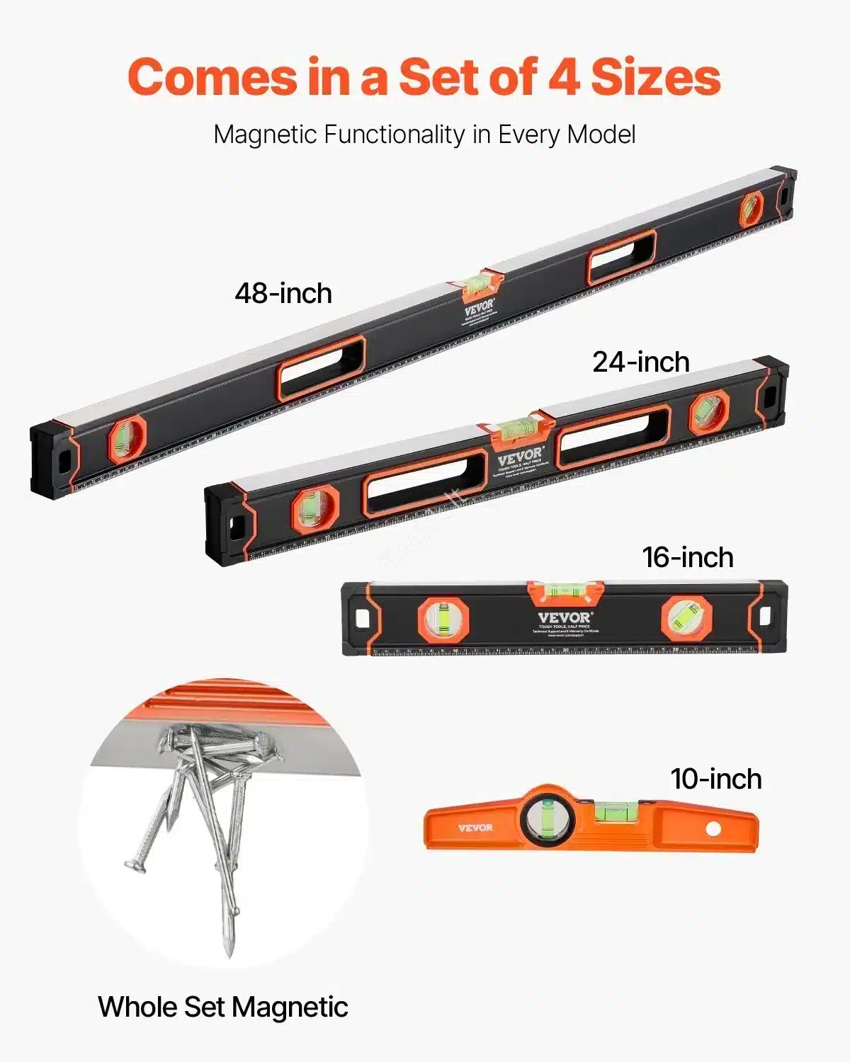 Magnetinių Gulsčiukų Rinkinys (4 vnt.): 120 cm, 60 cm, 40 cm, 25 cm, Juodas/Oranžinis, Aliuminis, Su 3 Libelėmis 🧲🛠️