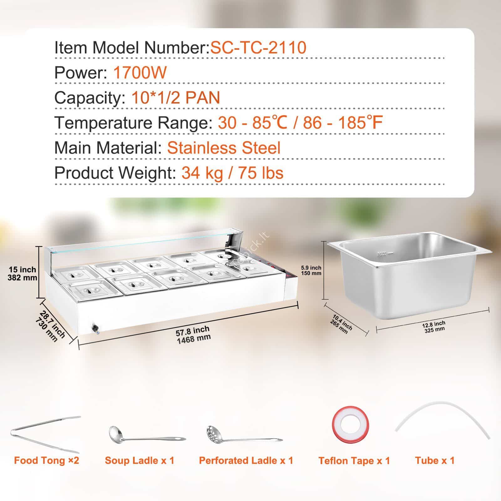 - Apima 10 talpyklų: mūsų komercinis maisto šildytuvas yra su dešimt 8Qt talpos indų (10 x 1/2 dydžio) ir atitinkamais dangteliais, leidžiančiais vienu metu patiekti skirtingus patiekalus. Galite keisti savo meniu, kaip norite, nuo sriubų ir padažų iki troškinių ar net nacho sūrio ir šokolado.