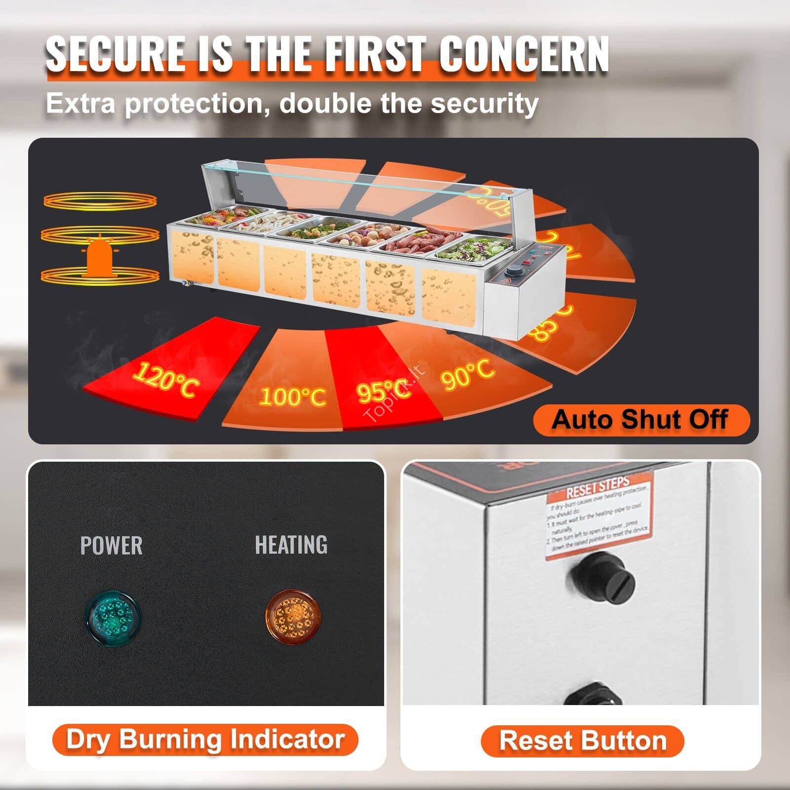 - Papildoma sauga: atnaujinome savo maisto šildytuvą su naujai sukurtu „sauso degimo indikatoriumi“ ir „atstatymo mygtuku“. Sauso degimo indikatoriaus funkcija automatiškai sustabdo maisto šildymą, kai temperatūra viršija 120 °C (248°F). Norėdami tęsti darbą, turite paspausti atstatymo mygtuką.