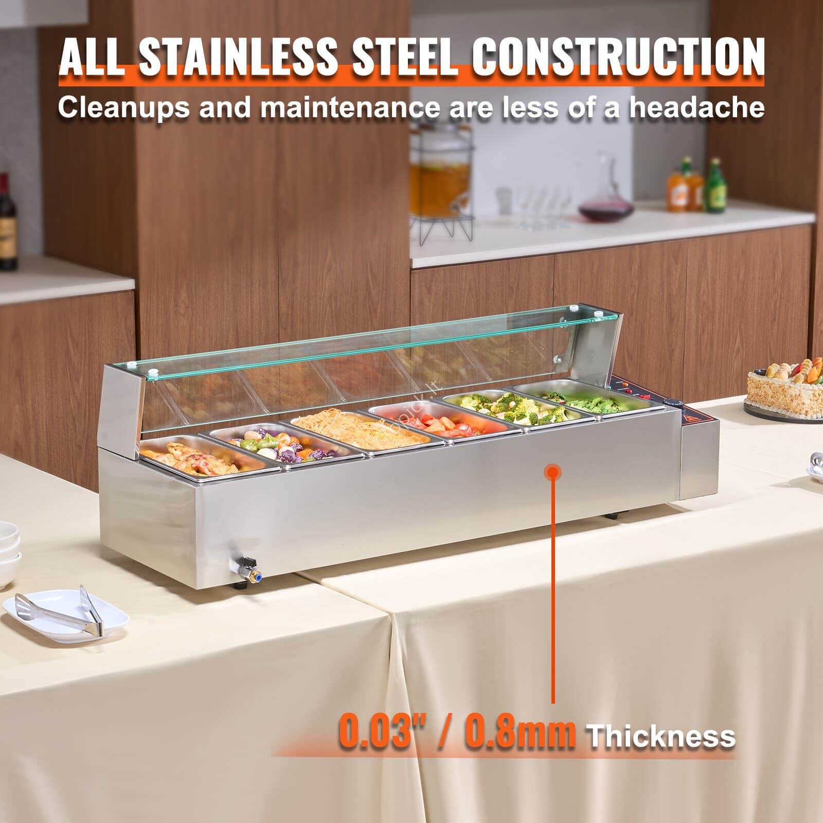 - Tvirta nerūdijančio plieno konstrukcija: šis maisto šildytuvas sukurtas taip, kad tarnautų. Jo tvirta nerūdijančio plieno konstrukcija atlaiko nuolatinį naudojimą, ją lengva valyti ir prižiūrėti. Vonia turi pastorintą sienelę (0,03 colio / 0,8 mm storio), kuri suteikia papildomo stabilumo ir užtikrina saugų vandens sandarumą.