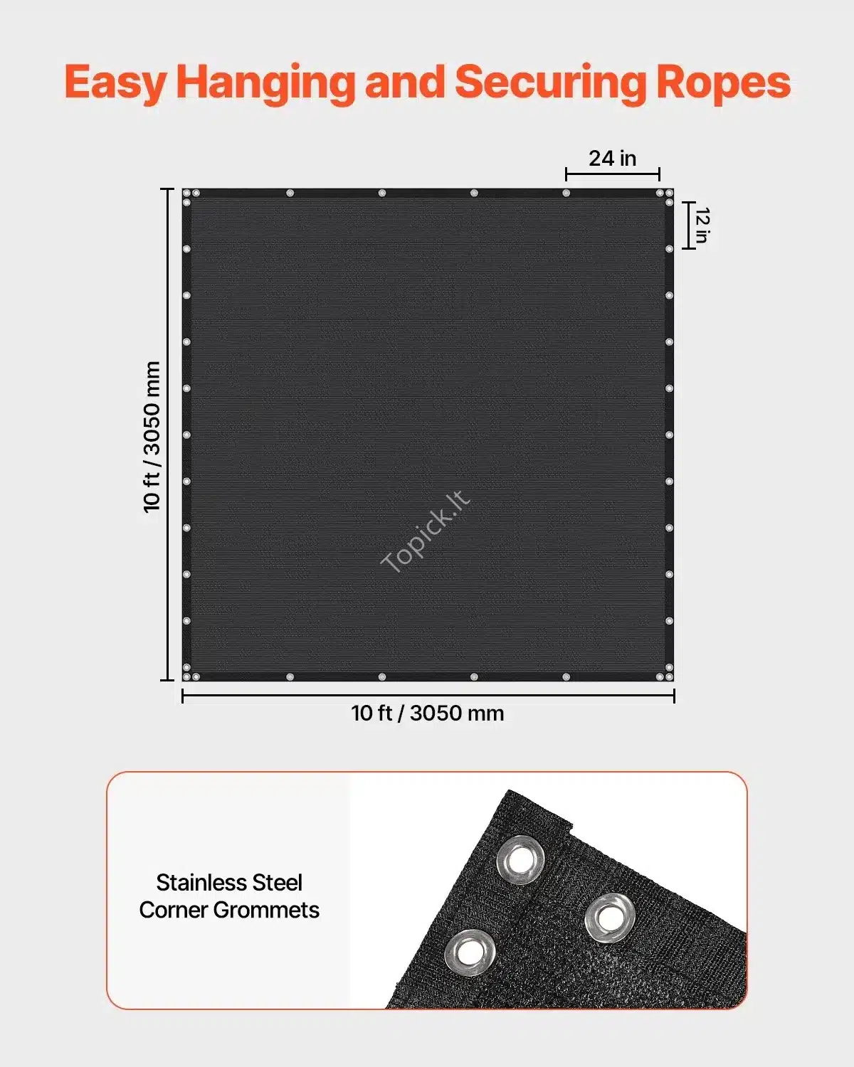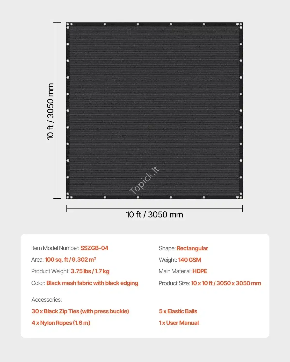 - Matmenys: Apsauginio tinklo matmenys – 305 x 305 cm (10 x 10 pėdos). Plotas – 9,3 m².