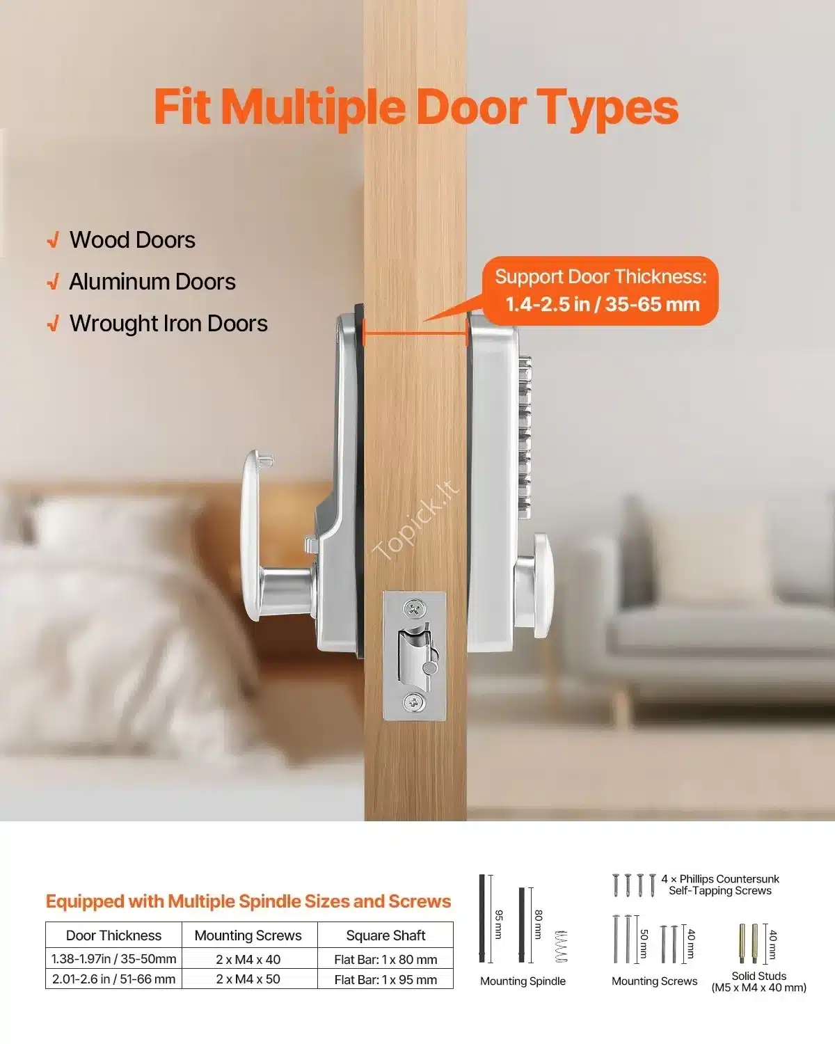 - Universalumas: Tinka durims, kurių storis nuo 35 mm iki 65 mm.