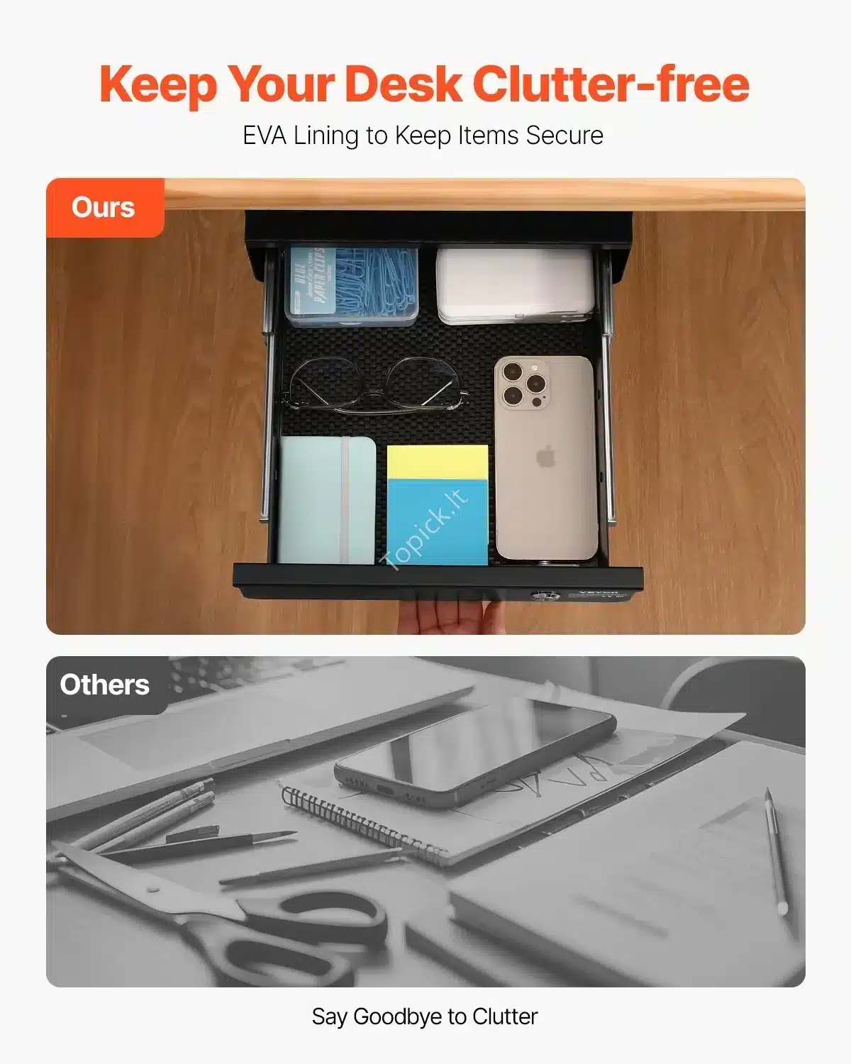- Apgalvotos Detalės: Stalčiaus viduje yra EVA putplasčio pamušalas, kuris apsaugo tavo daiktus nuo subraižymo ir neleidžia jiems slidinėti. O kad laidai nesimaišytų – yra ir specialios angos, pro kurias gali tvarkingai išvesti įkroviklius.