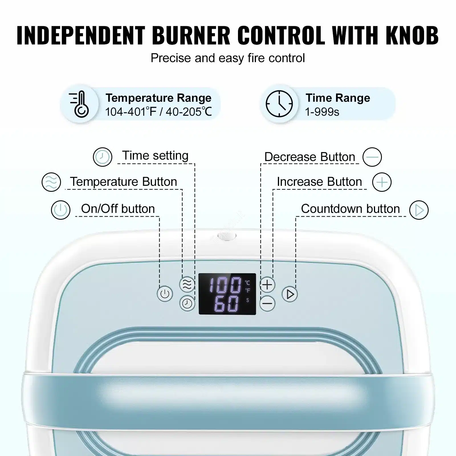 - Tikslus valdymas: Leidžia tiksliai reguliuoti temperatūrą nuo 40 °C iki 205 °C ir laiką nuo 1 iki 999 sekundžių.