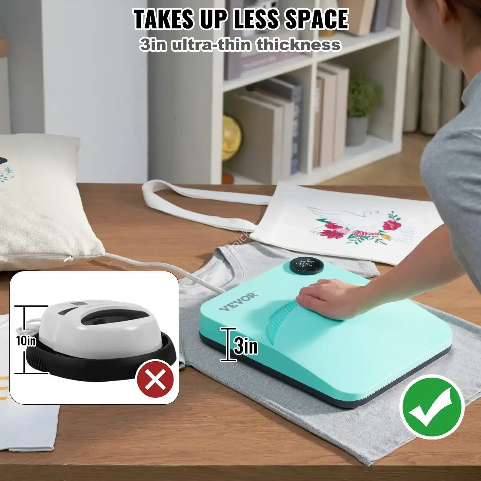 - Universalumas: Gali būti naudojamas ne tik kaip sublimacijos įrenginys, bet ir kaip lygintuvas drabužių lyginimui.