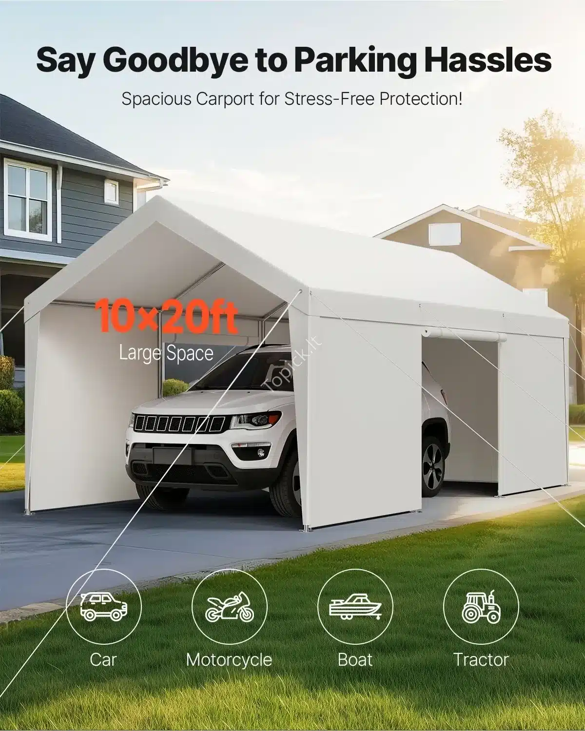 🚗 Apsaugokite savo automobilį, motociklą ar kitą techniką su erdvia ir patvaria užuovėja, kuri turi ir šonines sienas. Dydis: ilgis 609 cm, plotis 305 cm, aukštis 287 cm – puikiai tinka vienam didesniam automobiliui arba dviem mažesniems.