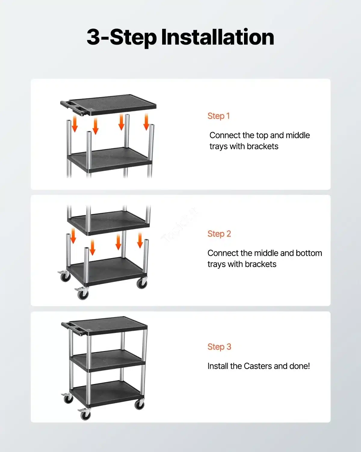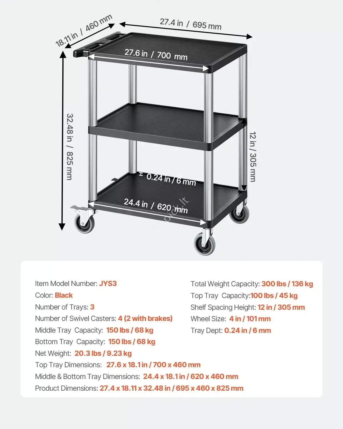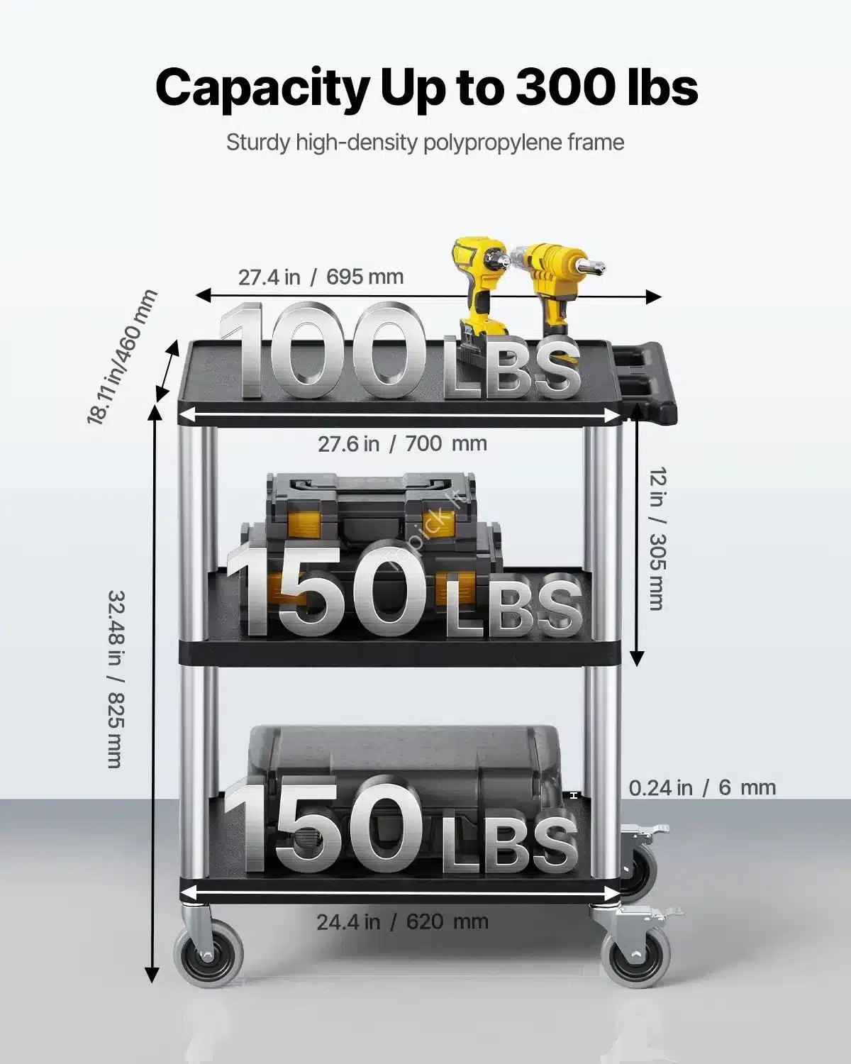 Ieškai kompaktiško, bet be galo patikimo pagalbininko savo dirbtuvėms, garažui ar sandėliui? Šis trijų lygių daugiafunkcinis vežimėlis yra puikus sprendimas, kai reikia viską patogiai susidėti ir lengvai transportuoti net siaurose erdvėse. Nors jis yra kompaktiškas, jo bendra keliamoji galia – net 136 kg (300 lbs)!