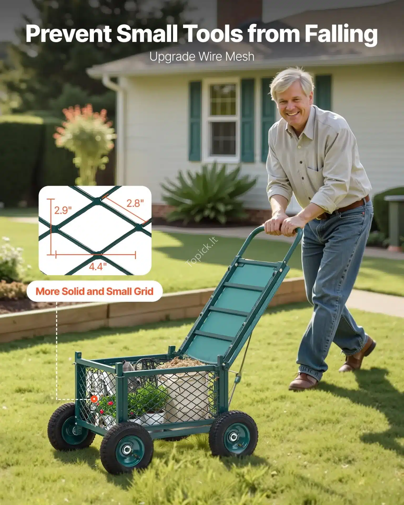 Tvirtas plieninis rėmas užtikrina ilgaamžiškumą, o dideli pneumatiniai guminiai ratai leidžia lengvai judėti bet kokiu paviršiumi, įskaitant žolę, gruntą ir nelygias vietas. 💨