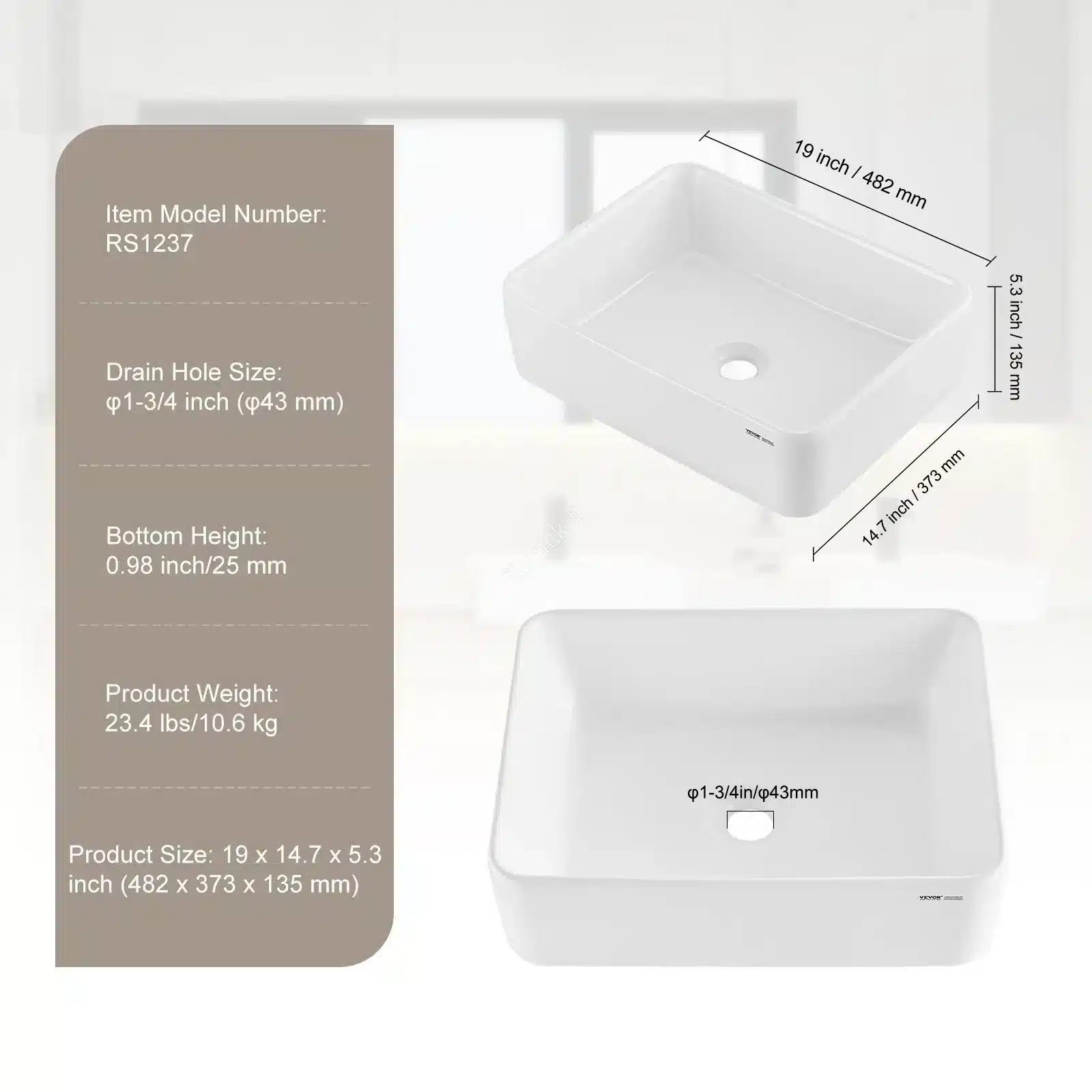 - Aukštis / Gylis: 135 mm (13,5 cm). Pakankamai gilus (5,3 colio), kad vanduo neaptaškytų stalviršio.