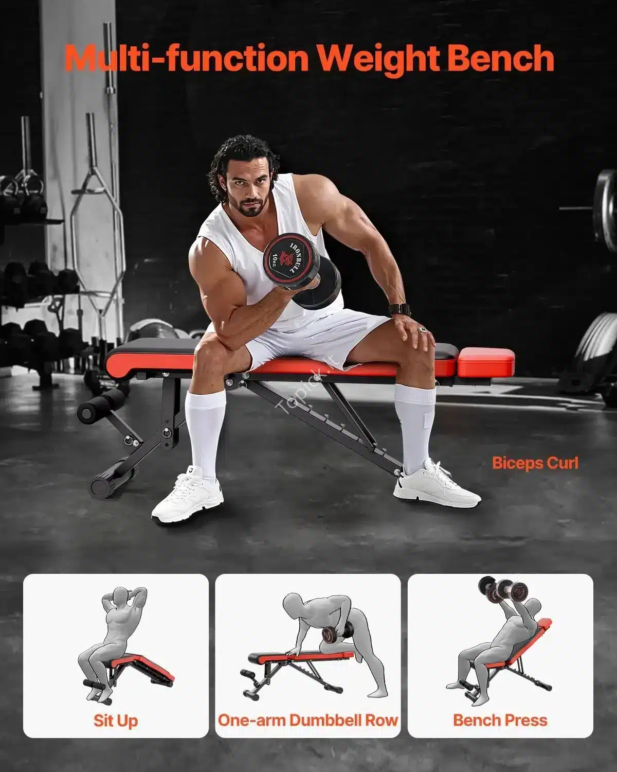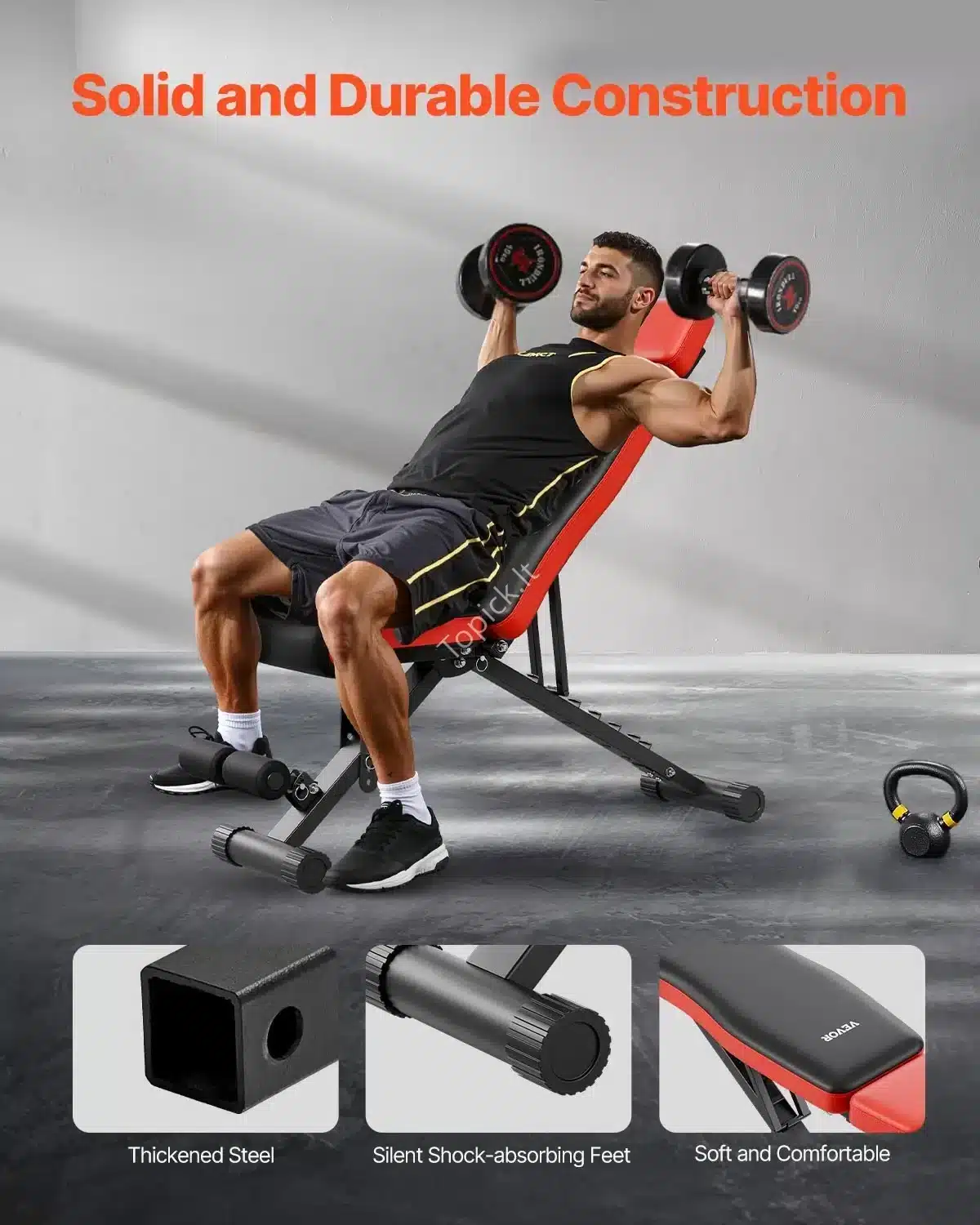 - Multifunkcionalumas: Tinka visoms pagrindinėms jėgos treniruotėms: hantelių spaudimui, eilėms, atsispaudimams, sėdimiems prisitraukimams (sit-up) ir kt.